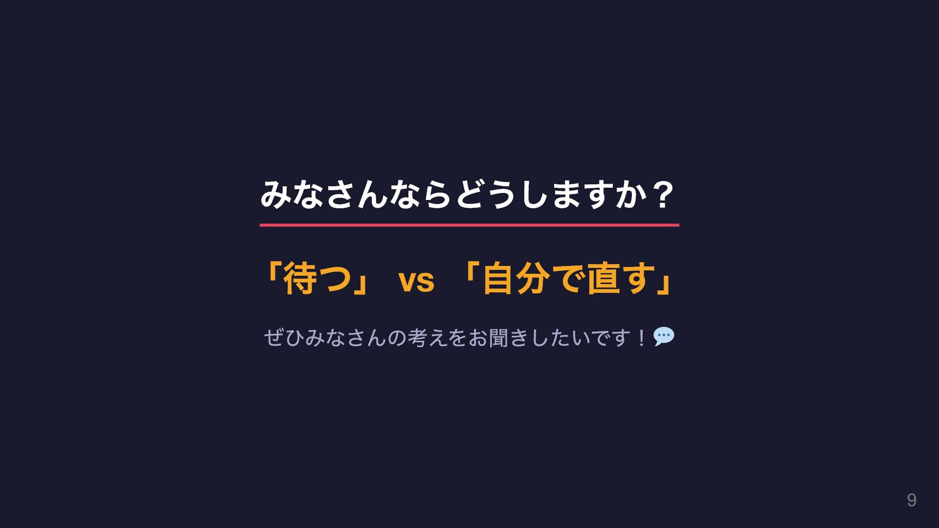 みなさんならどうしますか? 「待つ」 vs 「自分で直す」 ぜひみなさんの考えをお聞きしたいです! 9