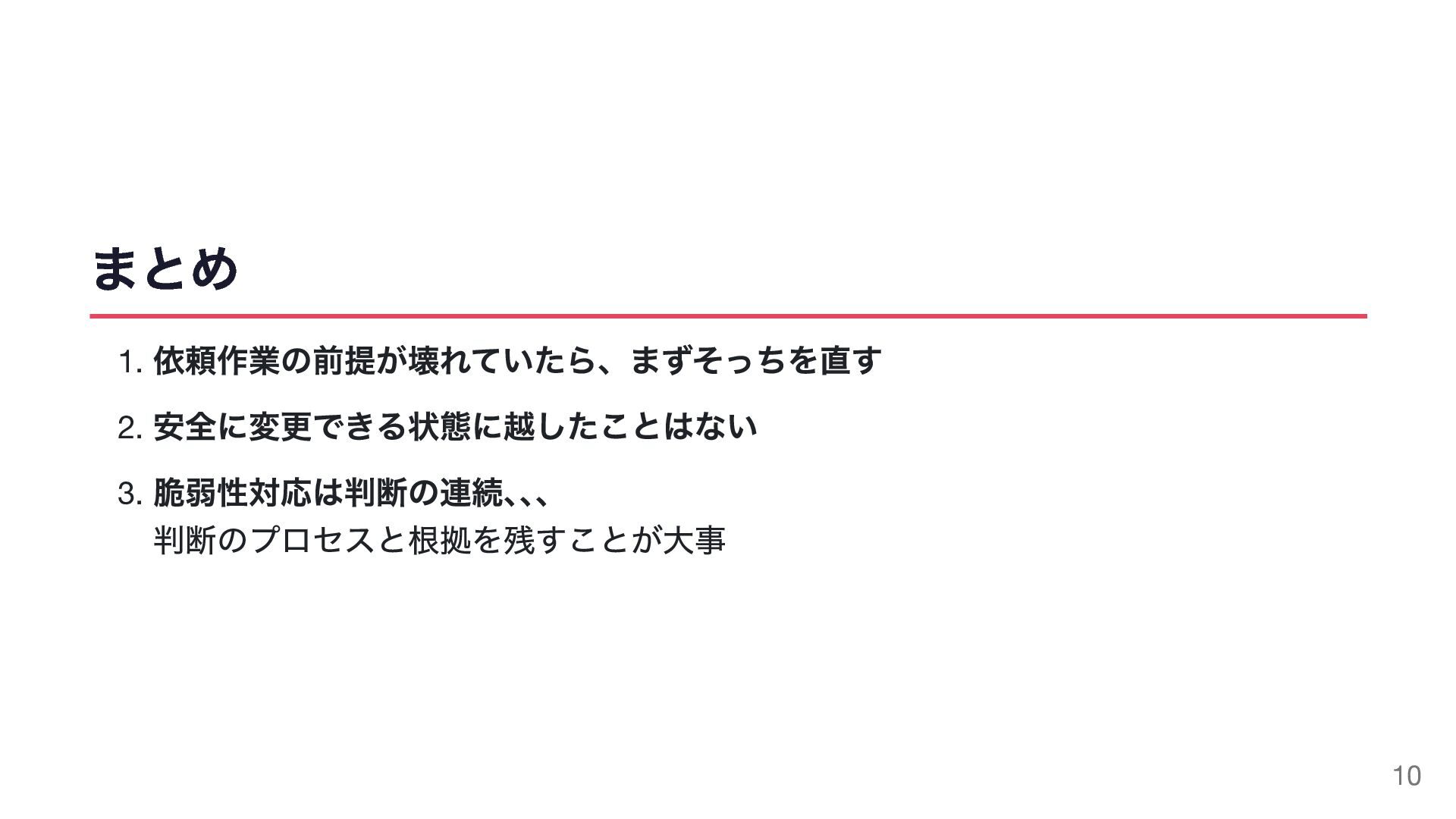 まとめ 1. 依頼作業の前提が壊れていたら、まずそっちを直す 2. 安全に変更できる状態に越したことはない 3. 脆弱性対応は判断の連続、 、 、 判断のプロセスと根拠を残すことが大事