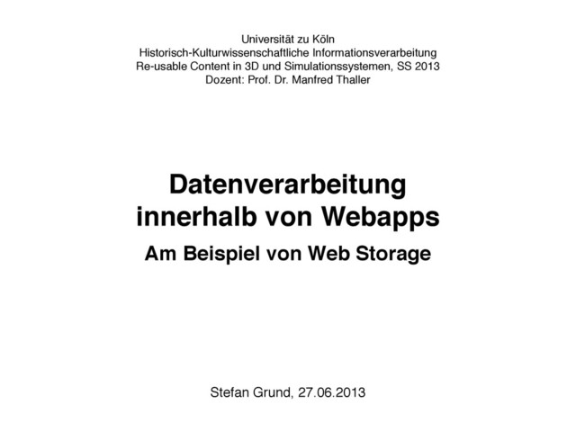 Simulationssystemen, SS 2013 Dozent: Prof. Dr. Manfred Thaller Datenverarbeitung innerhalb von Webapps Am Beispiel von Web Storage Stefan Grund, 27.06.2013