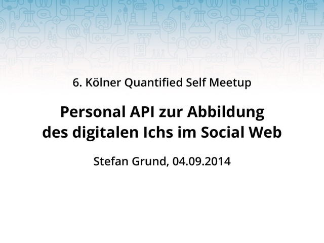 ‣ Bachelorarbeit: »Implementierung einer personen- bezogenen Programmierschnittstelle („Personal API“) zur Abbildung des digitalen Ichs im Social Web« ‣ Betreuer: Prof. Dr. Manfred Thaller, Historisch- Kulturwissenschaftliche Informationsverarbeitung ‣ Abgabe im April 2014 ‣ im August 2014 online und als eBook veröffentlicht → stefangrund.de/personalapi/ Hintergrund