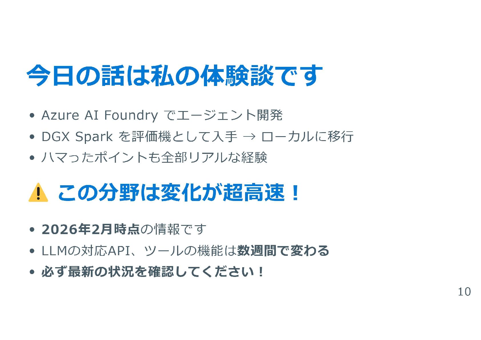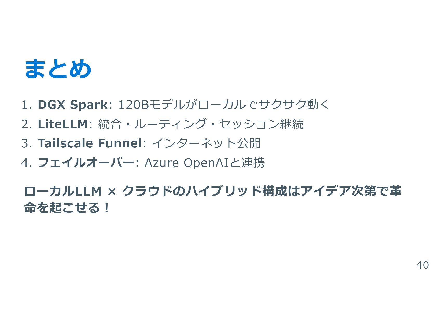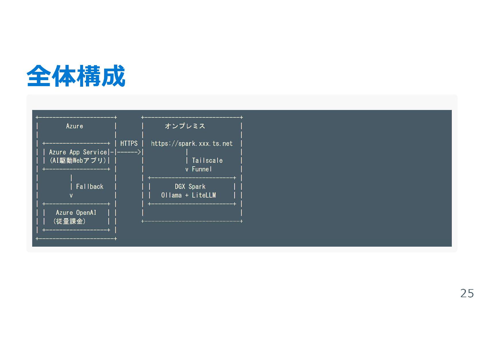 HCCJP 第70回勉強会で登壇した際のスライドです。 実際に自部で構築したAzure Appservice × NVIDIA DGX Sparkの構成およびアプリケーションに関しての体験談を共有しています。 かなり良い感じです。