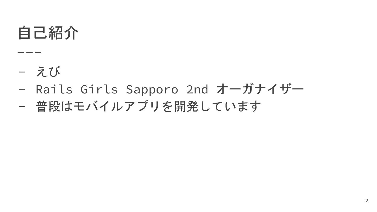 Rails Girls Sapporo 2nd:https://railsgirls.com/sapporo-2nd.html SAPPORO ENGINEER BASE #11:https://seb-sapporo.connpass.com/event/371324/
