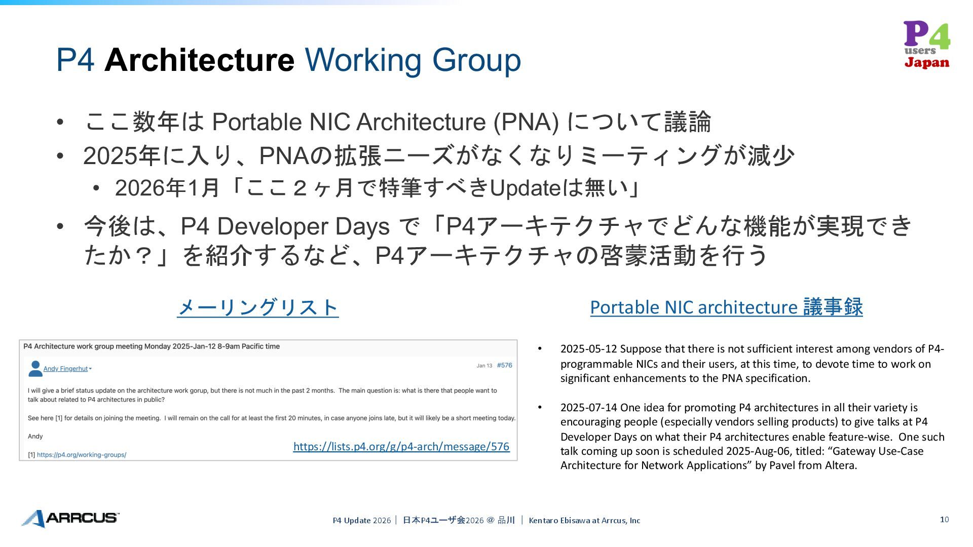 について議論 • 2025年に入り、PNAの拡張ニーズがなくなりミーティングが減少 • 2026年1月「ここ2ヶ月で特筆すべきUpdateは無い」 • 今後は、P4 Developer Days で「P4アーキテクチャでどんな機能が実現でき たか?」を紹介するなど、P4アーキテクチャの啓蒙活動を行う P4 Update 2026| 日本P4ユーザ会2026 @ 品川 | Kentaro Ebisawa at Arrcus, Inc 10 https://lists.p4.org/g/p4-arch/message/576 • 2025-05-12 Suppose that there is not sufficient interest among vendors of P4- programmable NICs and their users, at this time, to devote time to work on significant enhancements to the PNA specification. • 2025-07-14 One idea for promoting P4 architectures in all their variety is encouraging people (especially vendors selling products) to give talks at P4 Developer Days on what their P4 architectures enable feature-wise. One such talk coming up soon is scheduled 2025-Aug-06, titled: “Gateway Use-Case Architecture for Network Applications” by Pavel from Altera. Portable NIC architecture 議事録 メーリングリスト
