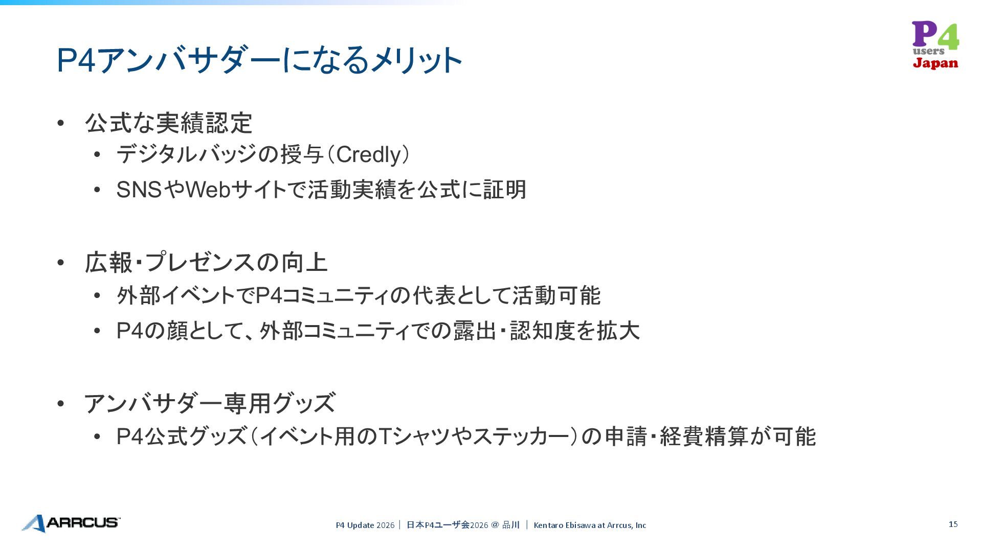 • SNSでのニュース・イベント拡散 • イベント登壇・代表活動 • P4ブースでの展示対応、スピーカーとしての登壇 • コミュニティの拡大と支援 • 新規コントリビューターやメンバーの開拓・歓迎・育成 • 地域の多様な才能を繋ぎ、包括的なコミュニティを構築 P4 Update 2026| 日本P4ユーザ会2026 @ 品川 | Kentaro Ebisawa at Arrcus, Inc 14