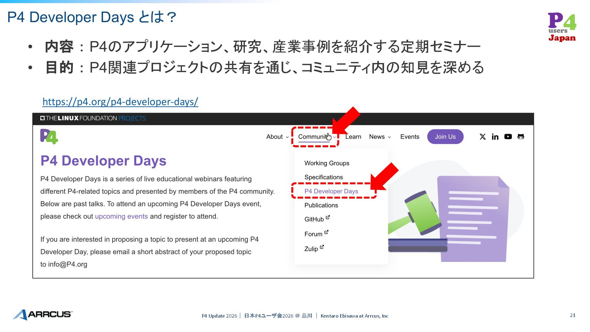 | Kentaro Ebisawa at Arrcus, Inc 21 • 内容 : P4のアプリケーション、研究、産業事例を紹介する定期セミナー • 目的 : P4関連プロジェクトの共有を通じ、コミュニティ内の知見を深める https://p4.org/p4-developer-days/
