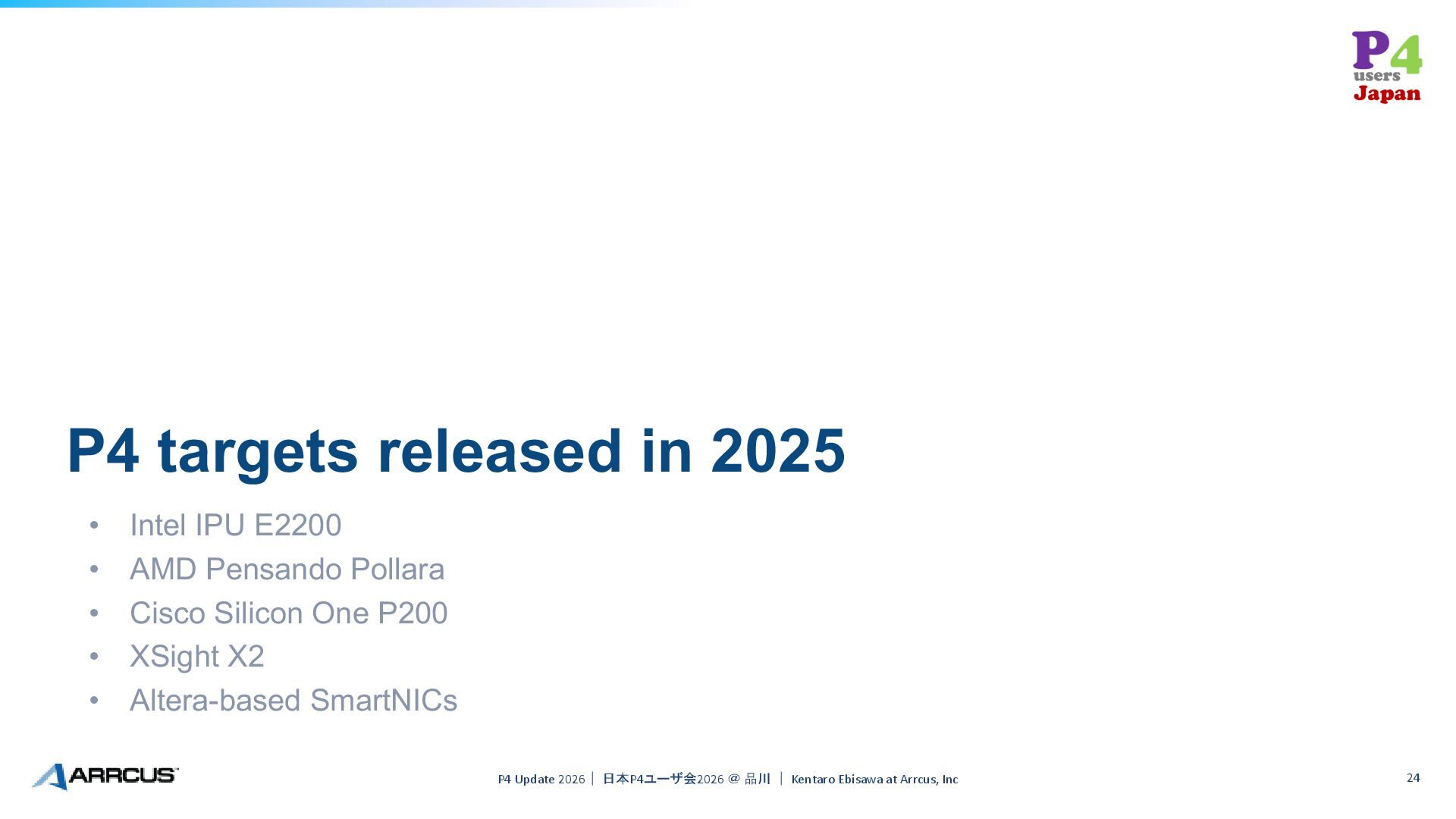 AMD Pensando Pollara • Cisco Silicon One P200 • XSight X2 • Altera-based SmartNICs P4 Update 2026| 日本P4ユーザ会2026 @ 品川 | Kentaro Ebisawa at Arrcus, Inc 24