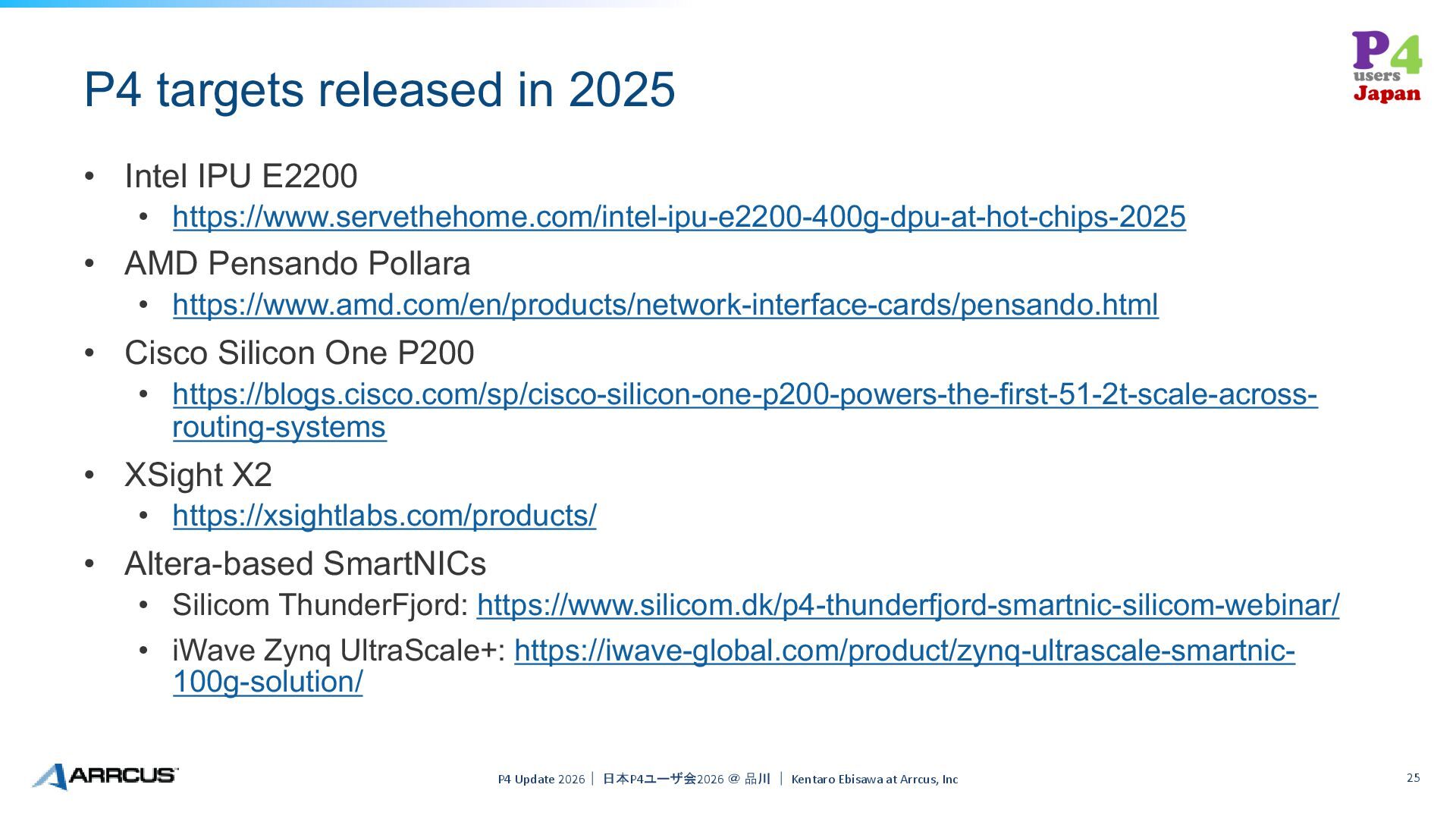 https://www.servethehome.com/intel-ipu-e2200-400g-dpu-at-hot-chips-2025 • AMD Pensando Pollara • https://www.amd.com/en/products/network-interface-cards/pensando.html • Cisco Silicon One P200 • https://blogs.cisco.com/sp/cisco-silicon-one-p200-powers-the-first-51-2t-scale-across- routing-systems • XSight X2 • https://xsightlabs.com/products/ • Altera-based SmartNICs • Silicom ThunderFjord: https://www.silicom.dk/p4-thunderfjord-smartnic-silicom-webinar/ • iWave Zynq UltraScale+: https://iwave-global.com/product/zynq-ultrascale-smartnic- 100g-solution/ P4 Update 2026| 日本P4ユーザ会2026 @ 品川 | Kentaro Ebisawa at Arrcus, Inc 25