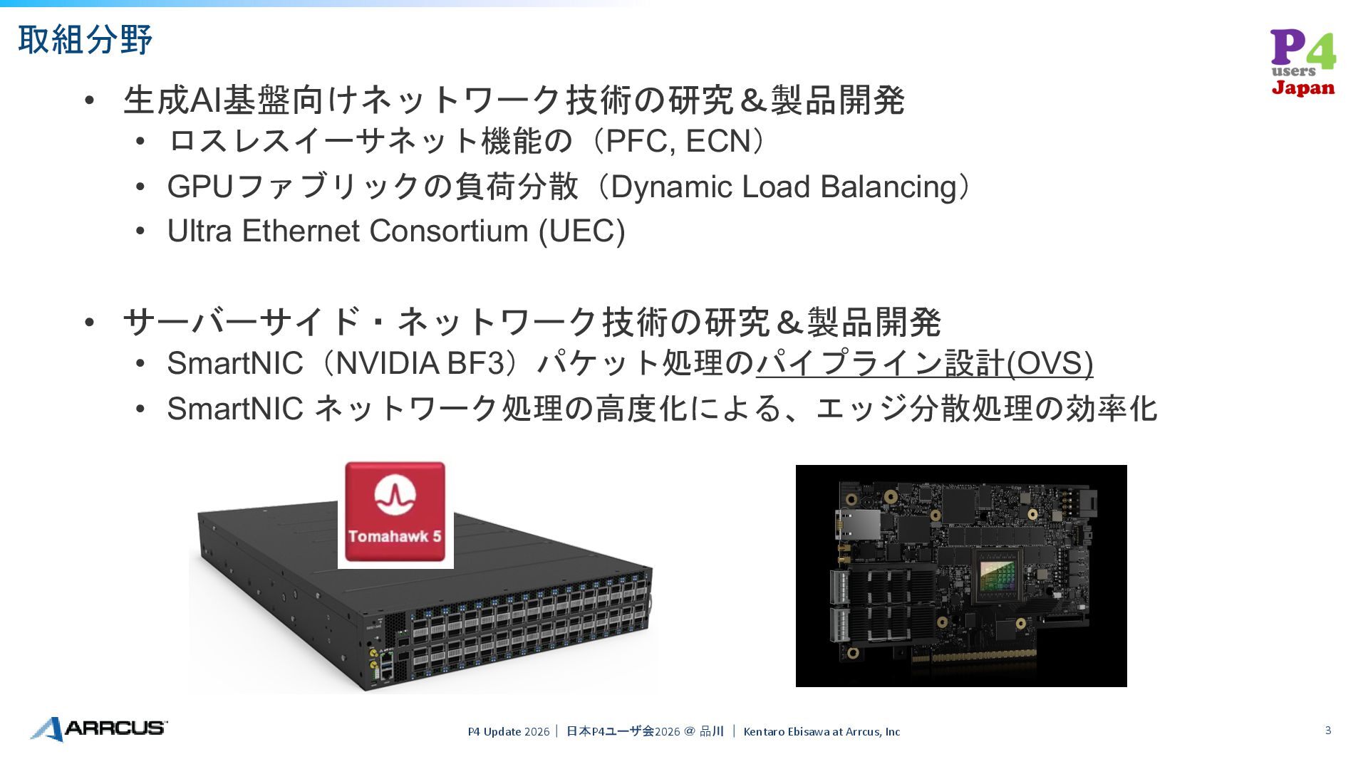 CTO: Keyur Patel • Ex-Cisco, Distinguished Engineer • Co-Chair IETF BGP & Sidrops WG • Chairman and CEO: Shekar Ayyar • Ex-VMware EVP & GM (14 years) 事業内容・特徴 • ホワイトボックススイッチを初め、様々なプラットフォーム上 でネットワーク機能を提供する “ネットワークOS” を開発 • 創業者CTO Keyur Patelを筆頭に、長年IETFで Working Group Chair などを務めているメンバーが多数在籍 • ユーザ企業と共同での研究開発、製品実装、IETFでの標準化 、などを通じて新しい技術を生み出している Arrcus, Inc. 概要 (アーカス) P4 Update 2026| 日本P4ユーザ会2026 @ 品川 | Kentaro Ebisawa at Arrcus, Inc 2 本社:サンノゼ空港近く(SFOから35分)