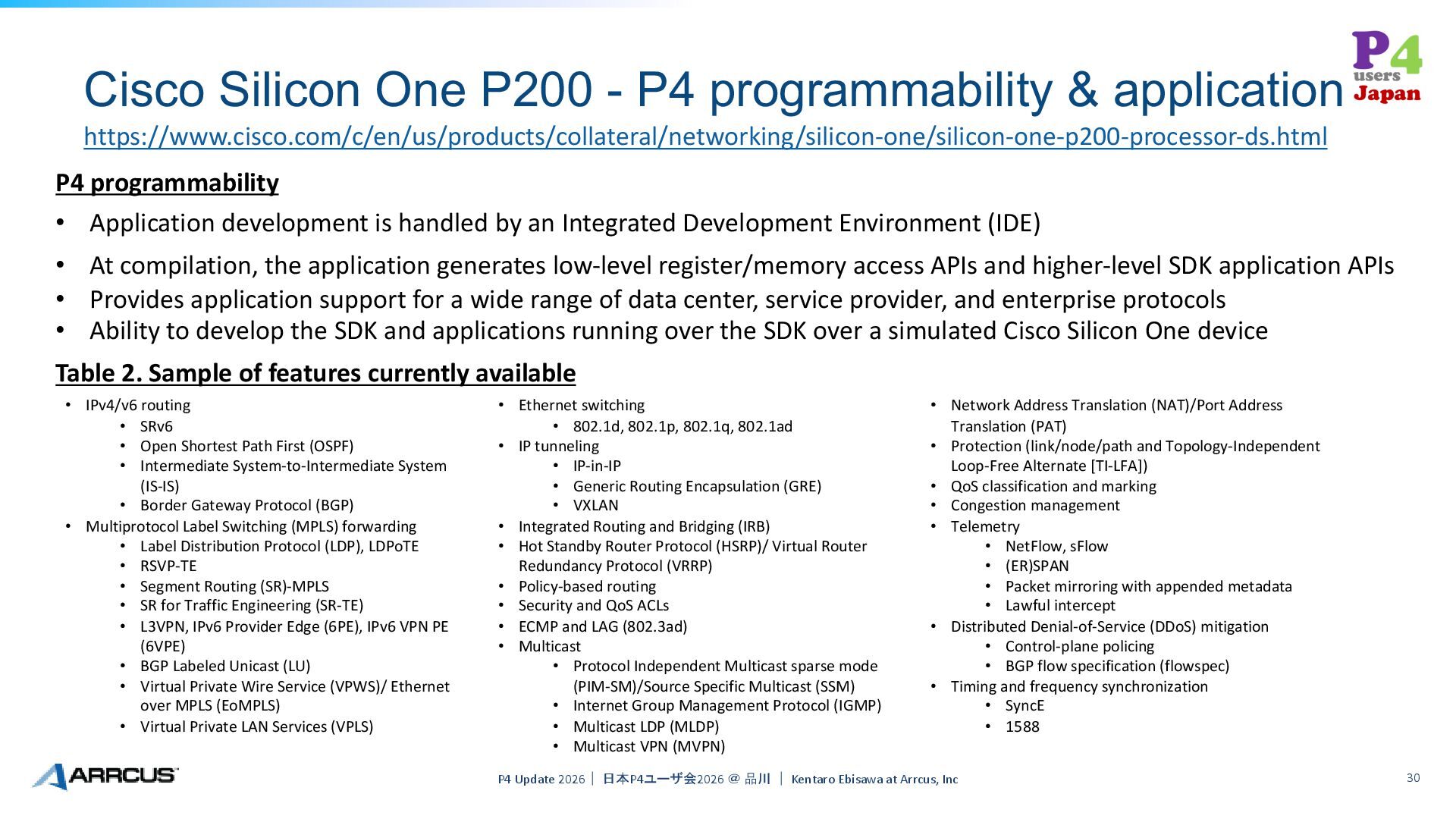 Update 2026| 日本P4ユーザ会2026 @ 品川 | Kentaro Ebisawa at Arrcus, Inc 30 P4 programmability • Application development is handled by an Integrated Development Environment (IDE) • At compilation, the application generates low-level register/memory access APIs and higher-level SDK application APIs • Provides application support for a wide range of data center, service provider, and enterprise protocols • Ability to develop the SDK and applications running over the SDK over a simulated Cisco Silicon One device Table 2. Sample of features currently available • IPv4/v6 routing • SRv6 • Open Shortest Path First (OSPF) • Intermediate System-to-Intermediate System (IS-IS) • Border Gateway Protocol (BGP) • Multiprotocol Label Switching (MPLS) forwarding • Label Distribution Protocol (LDP), LDPoTE • RSVP-TE • Segment Routing (SR)-MPLS • SR for Traffic Engineering (SR-TE) • L3VPN, IPv6 Provider Edge (6PE), IPv6 VPN PE (6VPE) • BGP Labeled Unicast (LU) • Virtual Private Wire Service (VPWS)/ Ethernet over MPLS (EoMPLS) • Virtual Private LAN Services (VPLS) • Ethernet switching • 802.1d, 802.1p, 802.1q, 802.1ad • IP tunneling • IP-in-IP • Generic Routing Encapsulation (GRE) • VXLAN • Integrated Routing and Bridging (IRB) • Hot Standby Router Protocol (HSRP)/ Virtual Router Redundancy Protocol (VRRP) • Policy-based routing • Security and QoS ACLs • ECMP and LAG (802.3ad) • Multicast • Protocol Independent Multicast sparse mode (PIM-SM)/Source Specific Multicast (SSM) • Internet Group Management Protocol (IGMP) • Multicast LDP (MLDP) • Multicast VPN (MVPN) • Network Address Translation (NAT)/Port Address Translation (PAT) • Protection (link/node/path and Topology-Independent Loop-Free Alternate [TI-LFA]) • QoS classification and marking • Congestion management • Telemetry • NetFlow, sFlow • (ER)SPAN • Packet mirroring with appended metadata • Lawful intercept • Distributed Denial-of-Service (DDoS) mitigation • Control-plane policing • BGP flow specification (flowspec) • Timing and frequency synchronization • SyncE • 1588 https://www.cisco.com/c/en/us/products/collateral/networking/silicon-one/silicon-one-p200-processor-ds.html