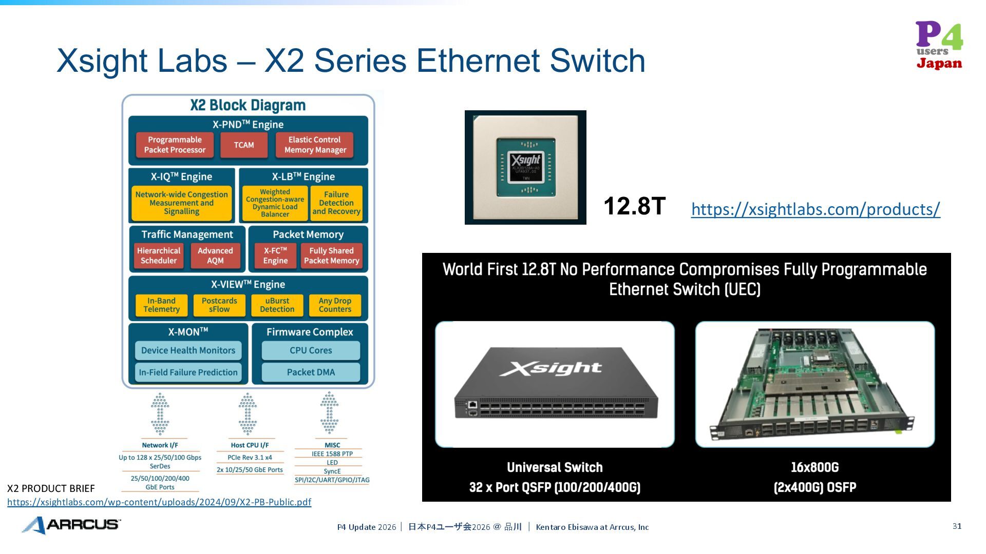 日本P4ユーザ会2026 @ 品川 | Kentaro Ebisawa at Arrcus, Inc 31 https://xsightlabs.com/products/ 12.8T X2 PRODUCT BRIEF https://xsightlabs.com/wp-content/uploads/2024/09/X2-PB-Public.pdf