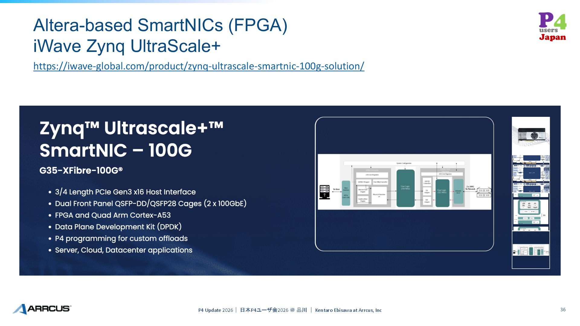 36. Altera-based SmartNICs (FPGA) iWave Zynq UltraScale+ P4 Update 2026| 日本P4ユーザ会2026