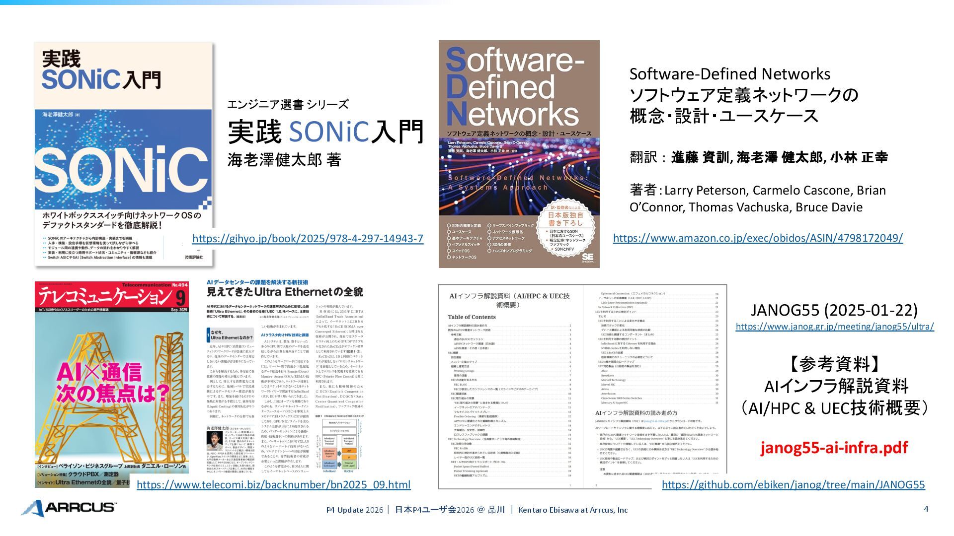 Arrcus, Inc 4 エンジニア選書 シリーズ 実践 SONiC入門 海老澤健太郎 著 https://gihyo.jp/book/2025/978-4-297-14943-7 Software-Defined Networks ソフトウェア定義ネットワークの 概念・設計・ユースケース 翻訳:進藤 資訓, 海老澤 健太郎, 小林 正幸 著者:Larry Peterson, Carmelo Cascone, Brian O’Connor, Thomas Vachuska, Bruce Davie https://www.amazon.co.jp/exec/obidos/ASIN/4798172049/ https://www.telecomi.biz/backnumber/bn2025_09.html https://github.com/ebiken/janog/tree/main/JANOG55 janog55-ai-infra.pdf JANOG55 (2025-01-22) https://www.janog.gr.jp/meeting/janog55/ultra/ 【参考資料】 AIインフラ解説資料 (AI/HPC & UEC技術概要)
