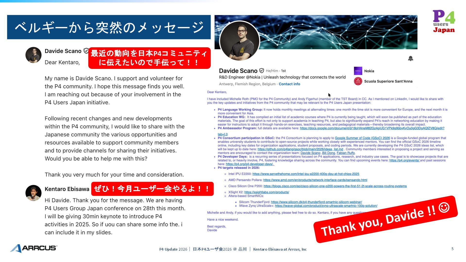 Arrcus, Inc 5 ベルギーから突然のメッセージ Thank you, Davide !! J 最近の動向を日本P4コミュニティ に伝えたいので手伝って!! ぜひ!今月ユーザー会やるよ!!