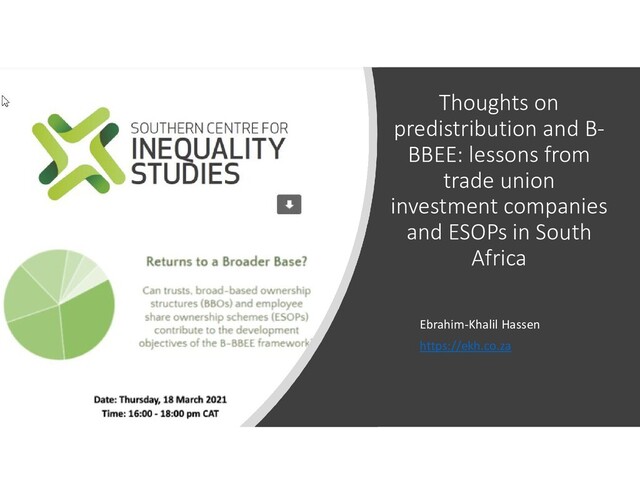 Presentation provides an update on a paper on trade union investment companies and ESOPS in South Africa. The paper discusses these options for broad based empowerment in the context of concept of redistribution and predistribution in South Africa. The presentation was delivered at a webinar organised by the South Centre for Inequality Studies at the University of the Witwatersrand. The paper is available at https://mistra.org.za/mistra-media/return-to-workers-trade-union-investment-companies-and-esops/