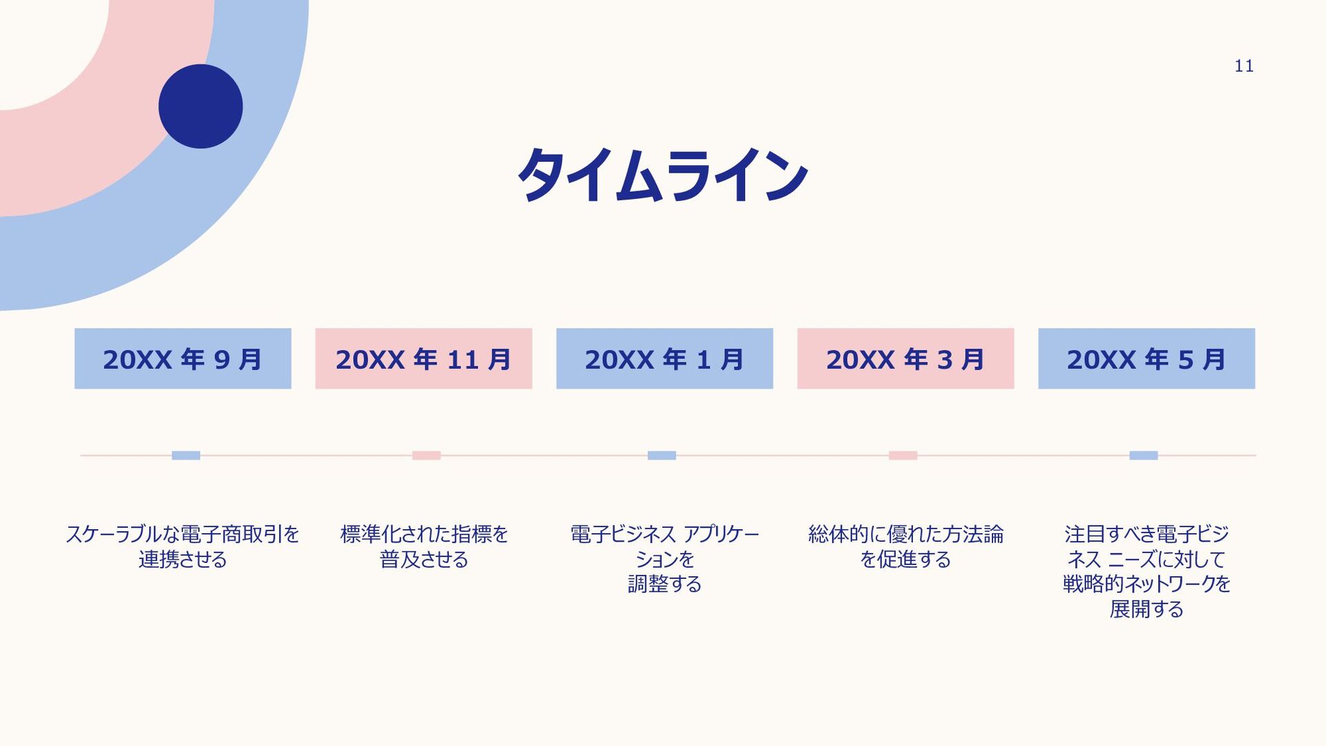 20XX 年 1 月 20XX 年 3 月 20XX 年 5 月 スケーラブルな電子商取引を 連携させる 標準化された指標を 普及させる 電子ビジネス アプリケー ションを 調整する 総体的に優れた方法論 を促進する 注目すべき電子ビジ ネス ニーズに対して 戦略的ネットワークを 展開する
