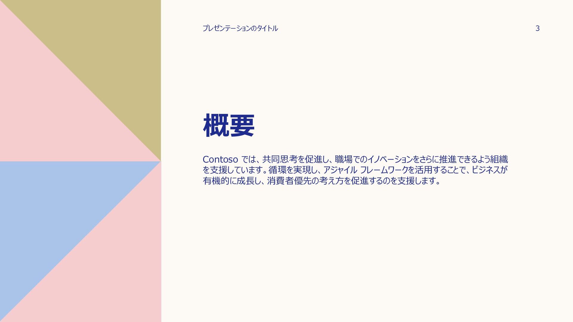 概要 Contoso では、共同思考を促進し、職場でのイノベーションをさらに推進できるよう組織 を支援しています。循環を実現し、アジャイル フレームワークを活用することで、ビジネスが 有機的に成長し、消費者優先の考え方を促進するのを支援します。 プレゼンテーションのタイトル 3