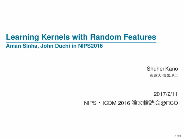 loss function c(x, y) • Two approach standard RFF • naive: W1, . . . , WD iid ∼ ˆ q, ϕi D = [ϕ(xi, W1) · · · ϕ(xi, WD)]⊤ arg min θ { n ∑ i=1 c ( 1 √ D θ⊤ϕi D , yi ) + r(θ) } (13) Proposed • efficient for D ≥ nnz(ˆ q): For w1, . . . wNw ∈ P0 (used before), arg min θ { n ∑ i=1 c(θ⊤diag(ˆ q)1/2ϕi, yi) + r(θ) } (14) 15 / 24