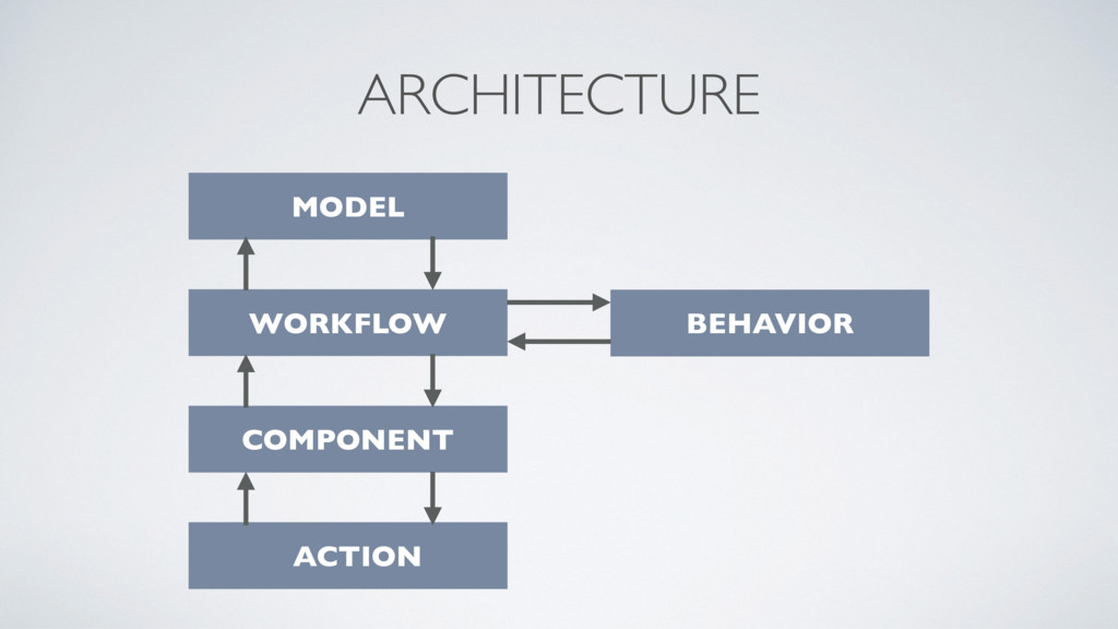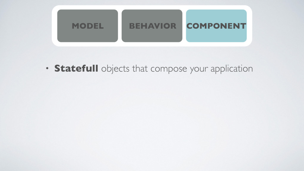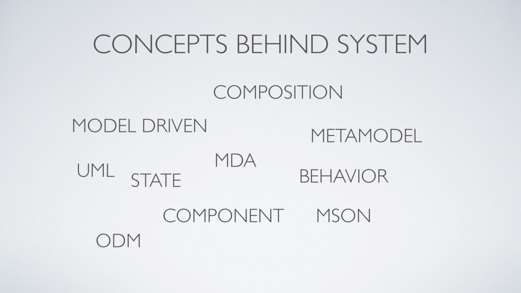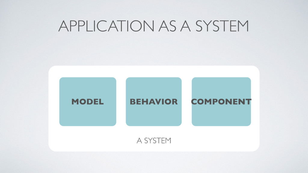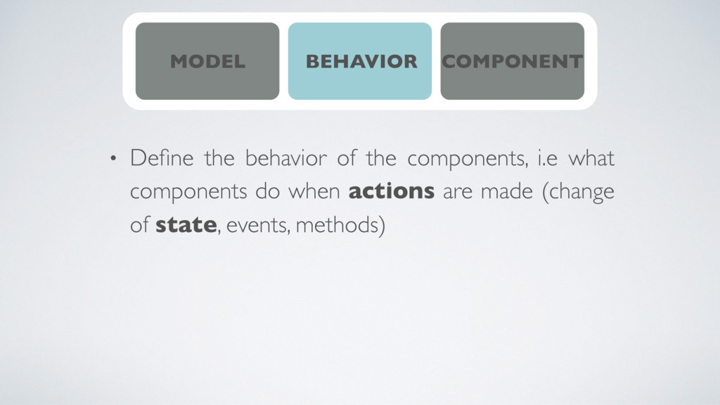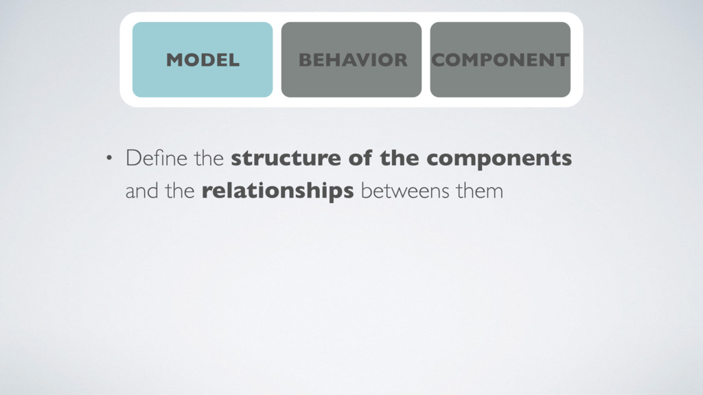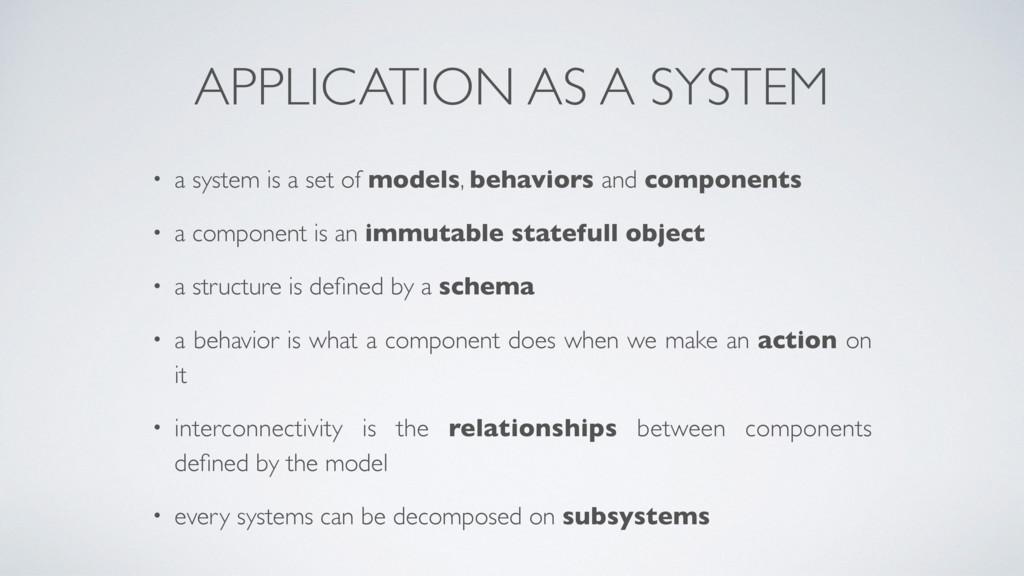 of models, behaviors and components • a component is an immutable statefull object • a structure is defined by a schema • a behavior is what a component does when we make an action on it • interconnectivity is the relationships between components defined by the model • every systems can be decomposed on subsystems
