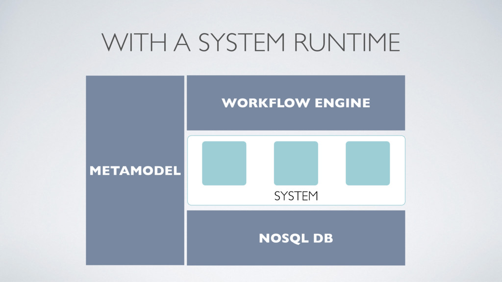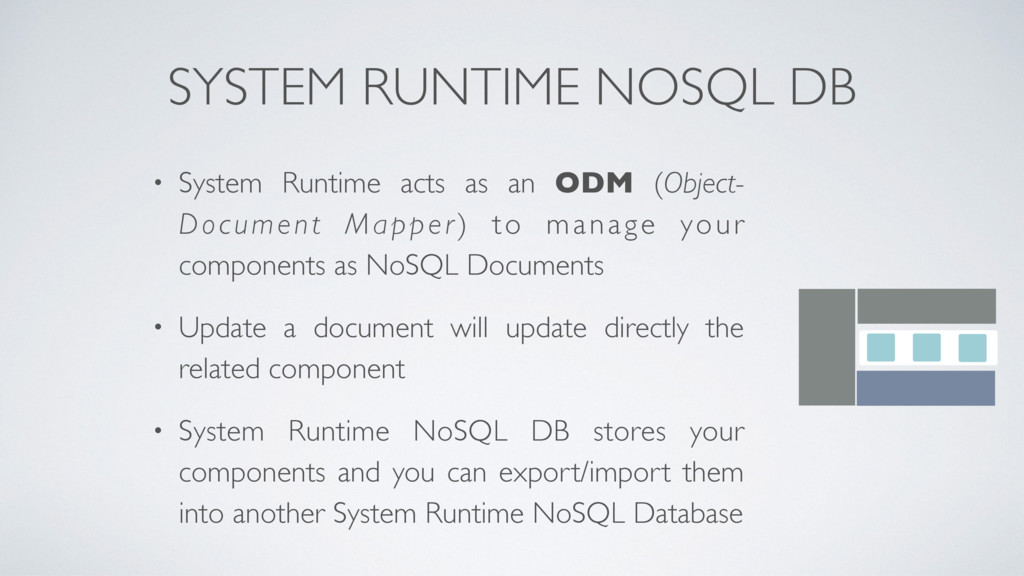ODM (Object- Document Mapper) to manage your components as NoSQL Documents • Update a document will update directly the related component • System Runtime NoSQL DB stores your components and you can export/import them into another System Runtime NoSQL Database