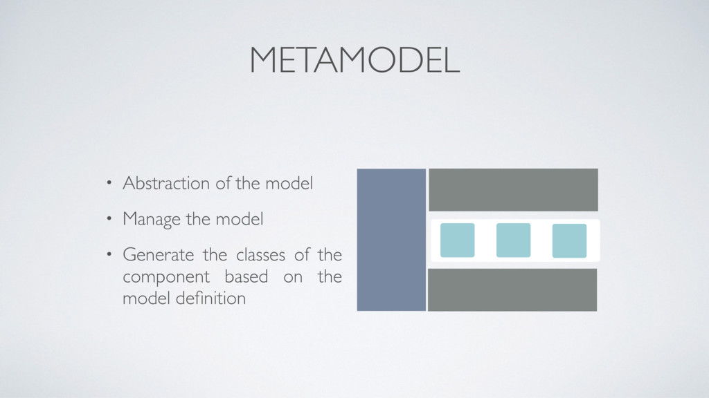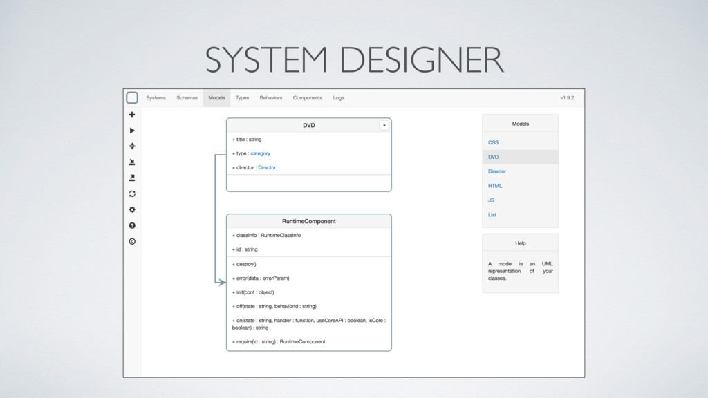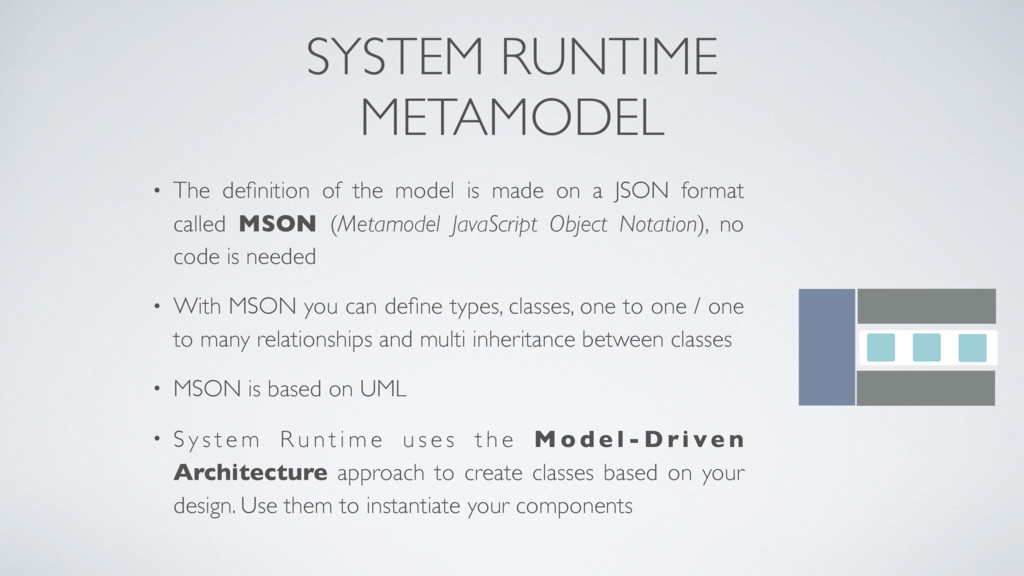 made on a JSON format called MSON (Metamodel JavaScript Object Notation), no code is needed • With MSON you can define types, classes, one to one / one to many relationships and multi inheritance between classes • MSON is based on UML • S y s t e m R u n t i m e u s e s t h e M o d e l - D ri ve n Architecture approach to create classes based on your design. Use them to instantiate your components