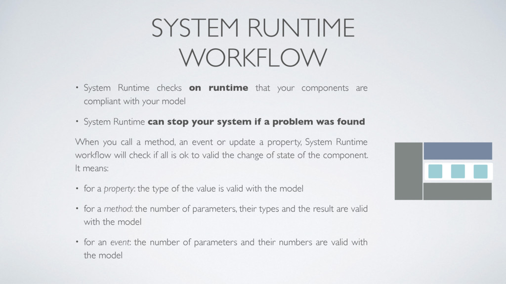 your components are compliant with your model • System Runtime can stop your system if a problem was found When you call a method, an event or update a property, System Runtime workflow will check if all is ok to valid the change of state of the component. It means: • for a property: the type of the value is valid with the model • for a method: the number of parameters, their types and the result are valid with the model • for an event: the number of parameters and their numbers are valid with the model