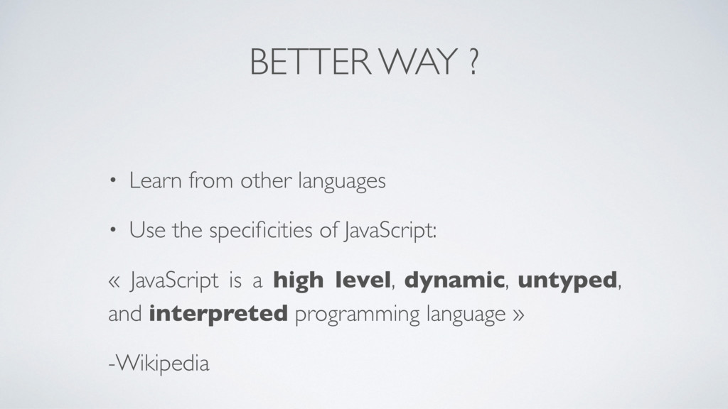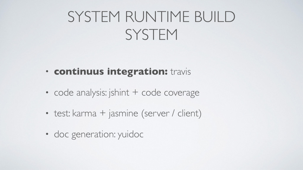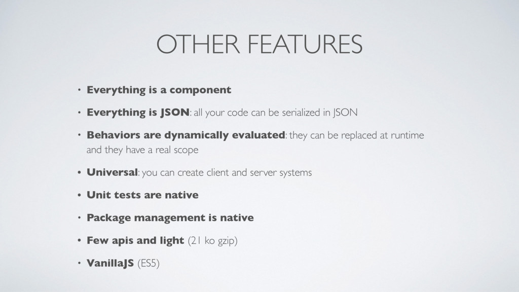 JSON: all your code can be serialized in JSON • Behaviors are dynamically evaluated: they can be replaced at runtime and they have a real scope • Universal: you can create client and server systems • Unit tests are native • Package management is native • Few apis and light (21 ko gzip) • VanillaJS (ES5)