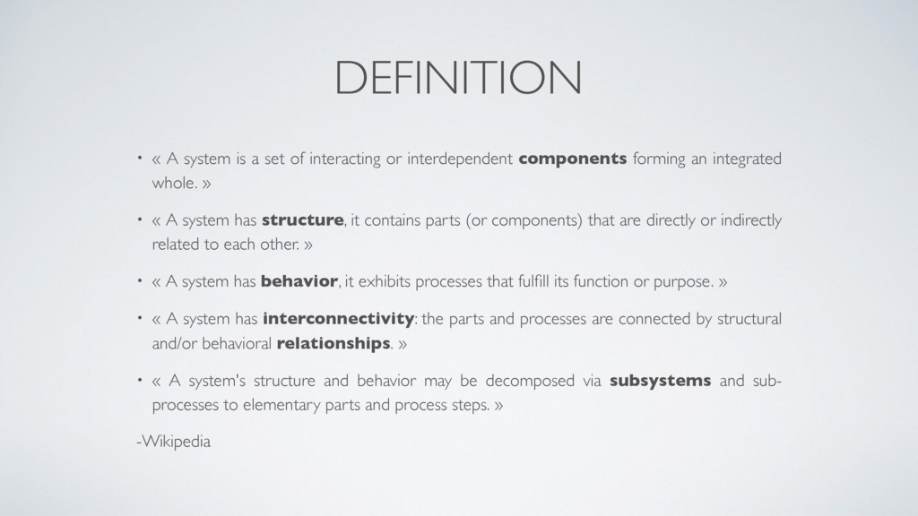 or interdependent components forming an integrated whole. » • « A system has structure, it contains parts (or components) that are directly or indirectly related to each other. » • « A system has behavior, it exhibits processes that fulfill its function or purpose. » • « A system has interconnectivity: the parts and processes are connected by structural and/or behavioral relationships. » • « A system's structure and behavior may be decomposed via subsystems and sub- processes to elementary parts and process steps. » -Wikipedia