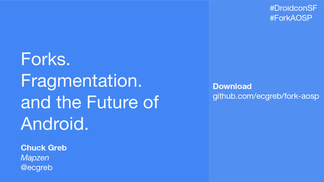 Android powers more than 80% of smartphones worldwide and shipped on over 1 billion devices in 2014. However the hidden story in these numbers is that Android forks now account for over 20% of the global Android ecosystem and 41% of new devices. Early on “fragmentation" was an issue of screen size, display density, and platform version. The new “fragmentation” is forked versions of the OS, proprietary APIs, and alternate app stores. This talk explores the Android Open Source Project (AOSP) and popular forks like Cyanogen, FireOS, and MIUI, as well as Google Play Services (Google’s fork of Android). We introduce specific strategies to help developers reach a wider audience with their applications.