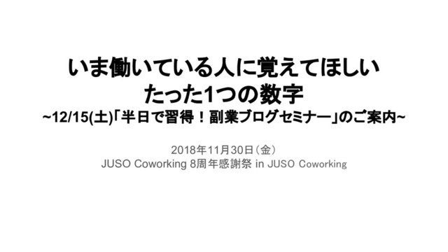 いま働いている人に覚えてほしい たった1つの数字 ~12/15(土)「半日で習得!副業ブログセミナー」のご案内~ 2018年11月30日(金) JUSO Coworking 8周年感謝祭 in JUSO Coworking