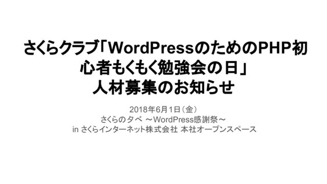 さくらクラブ「WordPressのためのPHP初 心者もくもく勉強会の日」 人材募集のお知らせ 2018年6月1日(金) さくらの夕べ 〜WordPress感謝祭〜 in さくらインターネット株式会社 本社オープンスペース