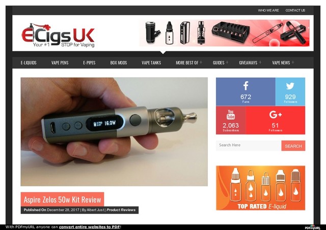 to the fact that the Zelos excels in all other areas of functionality. I would advise this model to those who are looking to progress to intermediate levels of vaping. Go to Vapour.co.uk to order the Aspire Zelos 50w Kit 4.56/5 (9) Please rate your personal experience if you have tried this PRODUCT / BRAND yourself ONLY on non-branded / generic pages you are rating the actual article: Submit Your Rating o AspireZelos Albert Just Although Albert is the tech-guy here at Ecigsuk.org.uk. He tested some of the new vape gear and started enjoying to describe his findings, so we can expect him to do some reviews for EcigsUK moving forward too. j s h 2 SHARES With PDFmyURL anyone can convert entire websites to PDF!