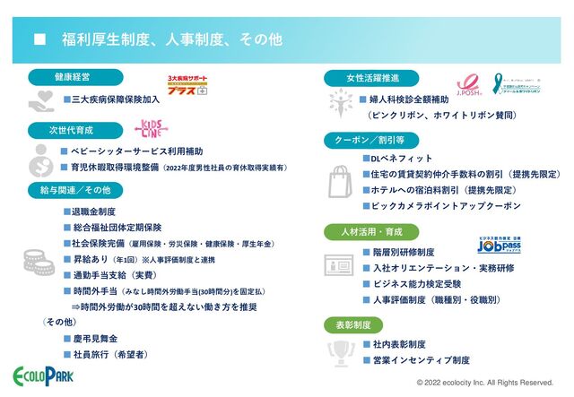 Inc. All Rights Reserved. 女性活躍推進 健康経営 ▪三大疾病保障保険加入 ▪ 階層別研修制度 ▪ 入社オリエンテーション・実務研修 ▪ ビジネス能力検定受験 ▪ 人事評価制度(職種別・役職別) 表彰制度 ▪ 社内表彰制度 ▪ 営業インセンティブ制度 ▪ 婦人科検診全額補助 (ピンクリボン、ホワイトリボン賛同) 人材活用・育成 クーポン/割引等 給与関連/その他 ▪退職金制度 ▪ 総合福祉団体定期保険 ▪社会保険完備(雇用保険・労災保険・健康保険・厚生年金) ▪ 昇給あり(年1回)※人事評価制度と連携 ▪ 通勤手当支給(実費) ▪ 時間外手当(みなし時間外労働手当(30時間分)を固定払) ⇒時間外労働が30時間を超えない働き方を推奨 ▪ 慶弔見舞金 ▪ 社員旅行(希望者) ▪DLベネフィット ▪住宅の賃貸契約仲介手数料の割引(提携先限定) ▪ホテルへの宿泊料割引(提携先限定) ▪ビックカメラポイントアップクーポン (その他)