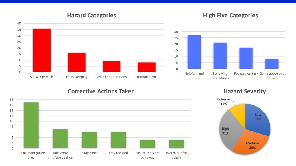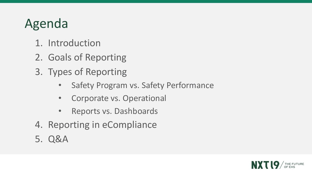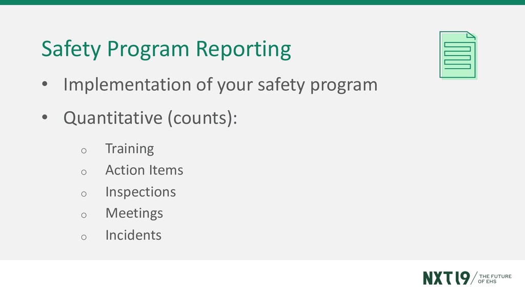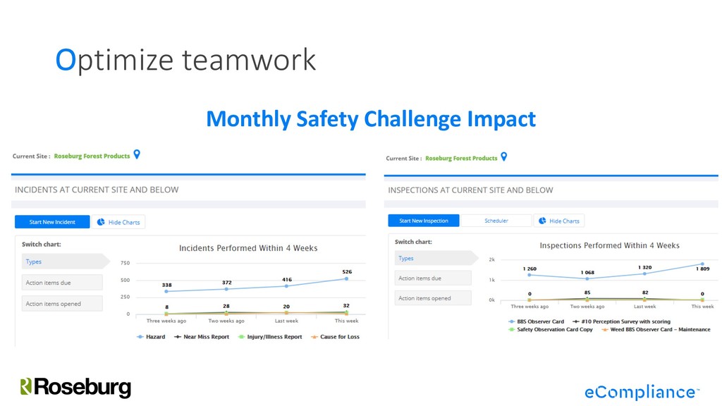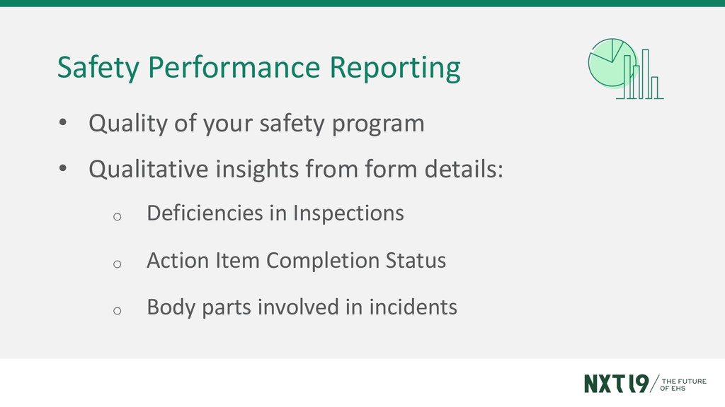 Incident-Hazard and Meeting by Date (Chart) • Safety Program reporting • Showcase filters • Forms > Inspection, Incident-Hazard & Meeting by Type and Title (Chart) • Safety Program Reporting • Showcase drill-down • Forms > Average Form Sign Off (Chart) • Safety Performance reporting • Mixture of visualizations & data tables common in reports • Forms > Incident Field Response • Safety Performance Reporting • Show how to use filters to save as new report • Action Items > Action Item Workflow Statistics (Chart) • Safety Performance Reporting • Create a dashboard • Total # of Inspections by Employee • Top deficiencies • Subscribe to dashboard