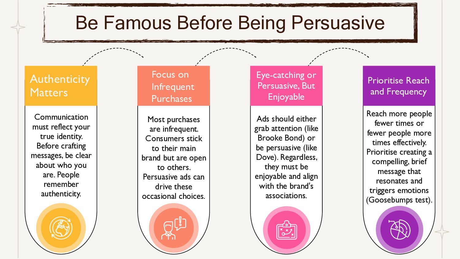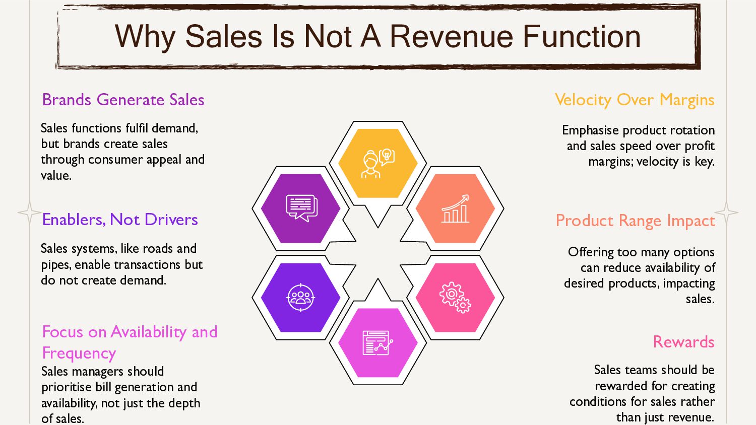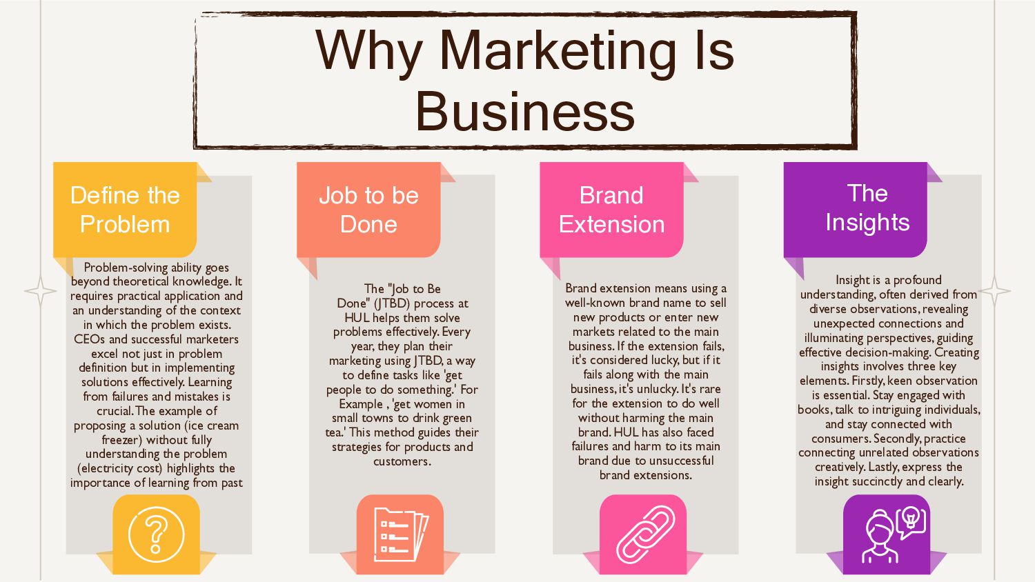 requires practical application and an understanding of the context in which the problem exists. CEOs and successful marketers excel not just in problem definition but in implementing solutions effectively. Learning from failures and mistakes is crucial. The example of proposing a solution (ice cream freezer) without fully understanding the problem (electricity cost) highlights the importance of learning from past The Insights Insight is a profound understanding, often derived from diverse observations, revealing unexpected connections and illuminating perspectives, guiding effective decision-making. Creating insights involves three key elements. Firstly, keen observation is essential. Stay engaged with books, talk to intriguing individuals, and stay connected with consumers. Secondly, practice connecting unrelated observations creatively. Lastly, express the insight succinctly and clearly. Job to be Done The "Job to Be Done" (JTBD) process at HUL helps them solve problems effectively. Every year, they plan their marketing using JTBD, a way to define tasks like 'get people to do something.' For Example , 'get women in small towns to drink green tea.' This method guides their strategies for products and customers. Brand Extension Brand extension means using a well-known brand name to sell new products or enter new markets related to the main business. If the extension fails, it's considered lucky, but if it fails along with the main business, it's unlucky. It's rare for the extension to do well without harming the main brand. HUL has also faced failures and harm to its main brand due to unsuccessful brand extensions. Why Marketing Is Business