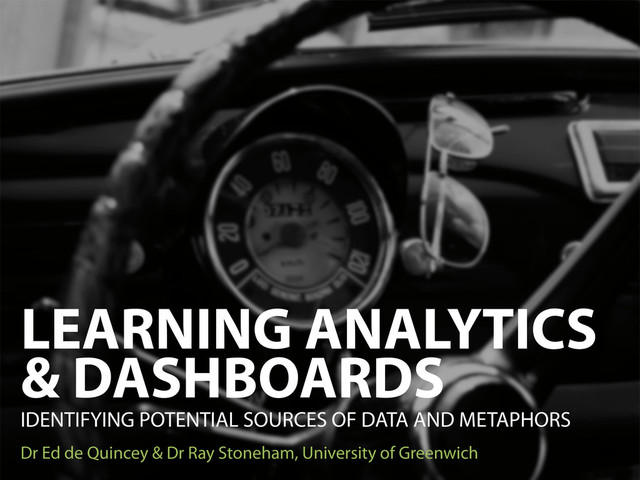 Increasingly, student data is being aggregated and presented to tutors in the form of a Dashboard e.g. the University of Southampton’s “Student Dashboard” (JISC, 2011) but a further problem is that the representations being used are often based upon the ability of the developer to extract information from disparate sources and not on the types of data and interpretive needs of the user, usually falling far short of their potential (Few, 2006).