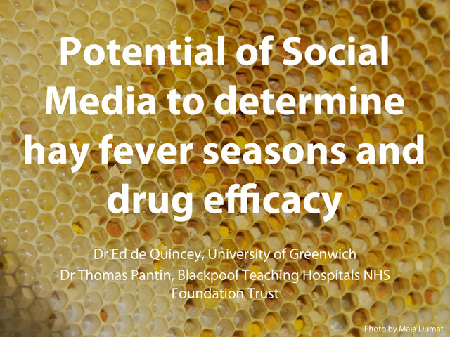 Currently, the Meteorological Office provide weekly pollen forecasts and the Royal College of General Practitioners (RCGP) produce weekly service reports. However the former is predicative and the latter is dependent on sufferers reporting to their GP. For researchers and sufferers of hay fever, there is currently no method for identifying real-time, geolocated hay fever incidence.