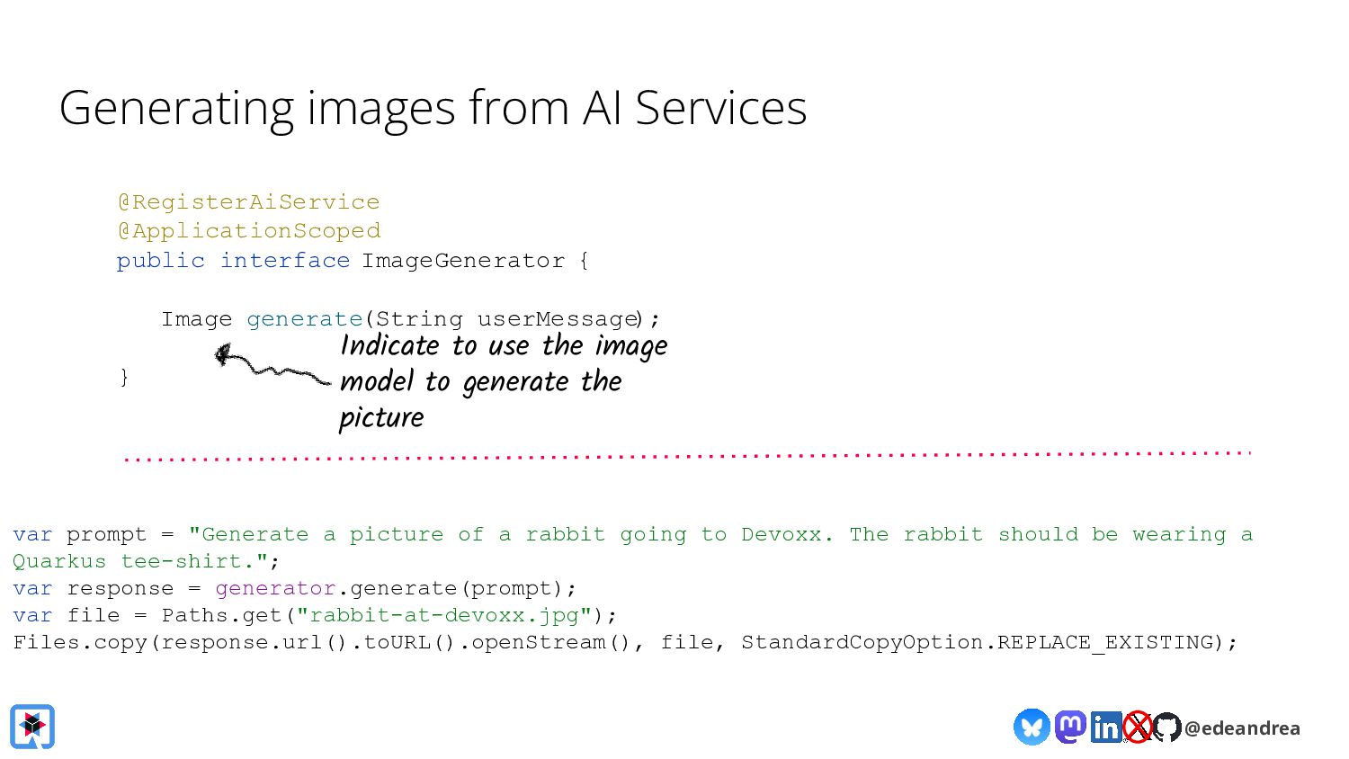 ImageGenerator { Image generate(String userMessage ); } Indicate to use the image model to generate the picture var prompt = "Generate a picture of a rabbit going to Devoxx. The rabbit should be wearing a Quarkus tee-shirt."; var response = generator.generate(prompt); var file = Paths.get("rabbit-at-devoxx.jpg"); Files.copy(response.url().toURL().openStream(), file, StandardCopyOption.REPLACE_EXISTING);