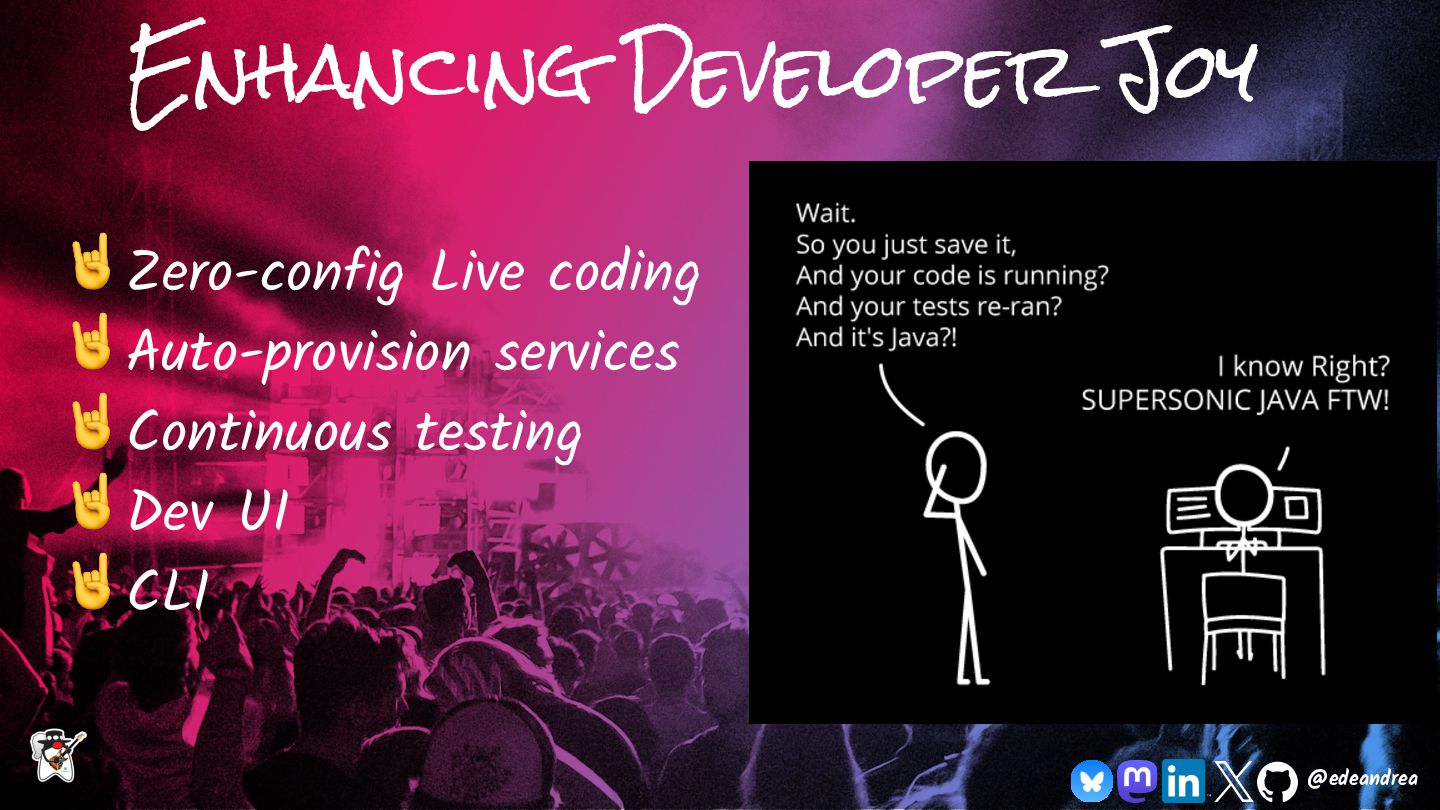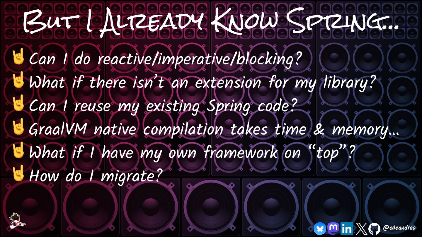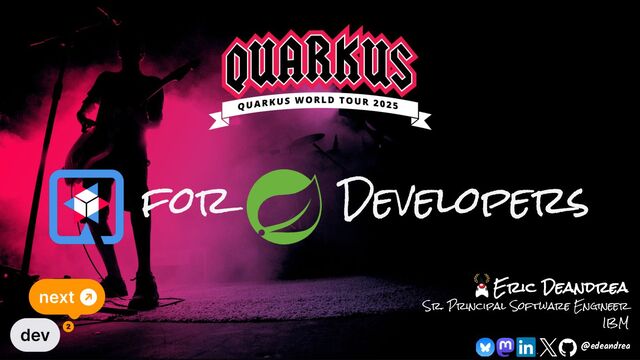 In this session, I will show concepts and conventions familiar to Spring developers and how those same concepts and conventions can be implemented in Quarkus, all while highlighting similarities and differences between them. Additionally, I will show similarities and differences in how testing is done, highlighting Quarkus Dev Services.