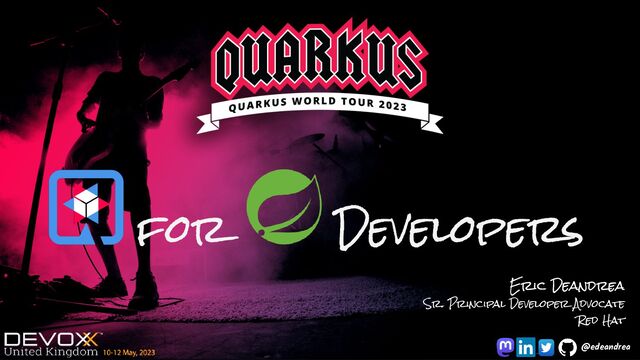 In this session, I will show concepts and conventions familiar to Spring developers and how those same concepts and conventions can be implemented in Quarkus, all while highlighting similarities and differences between them. Additionally, I will show similarities and differences in how testing is done, highlighting Quarkus Dev Services and continuous testing.