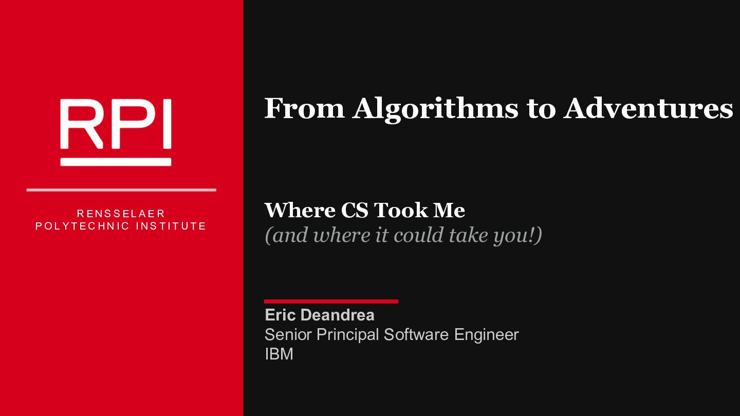 R P O L Y T E C H N I C I N S T I T U T E From Algorithms to Adventures Where CS Took Me (and where it could take you!) Eric Deandrea Senior Principal Software Engineer IBM
