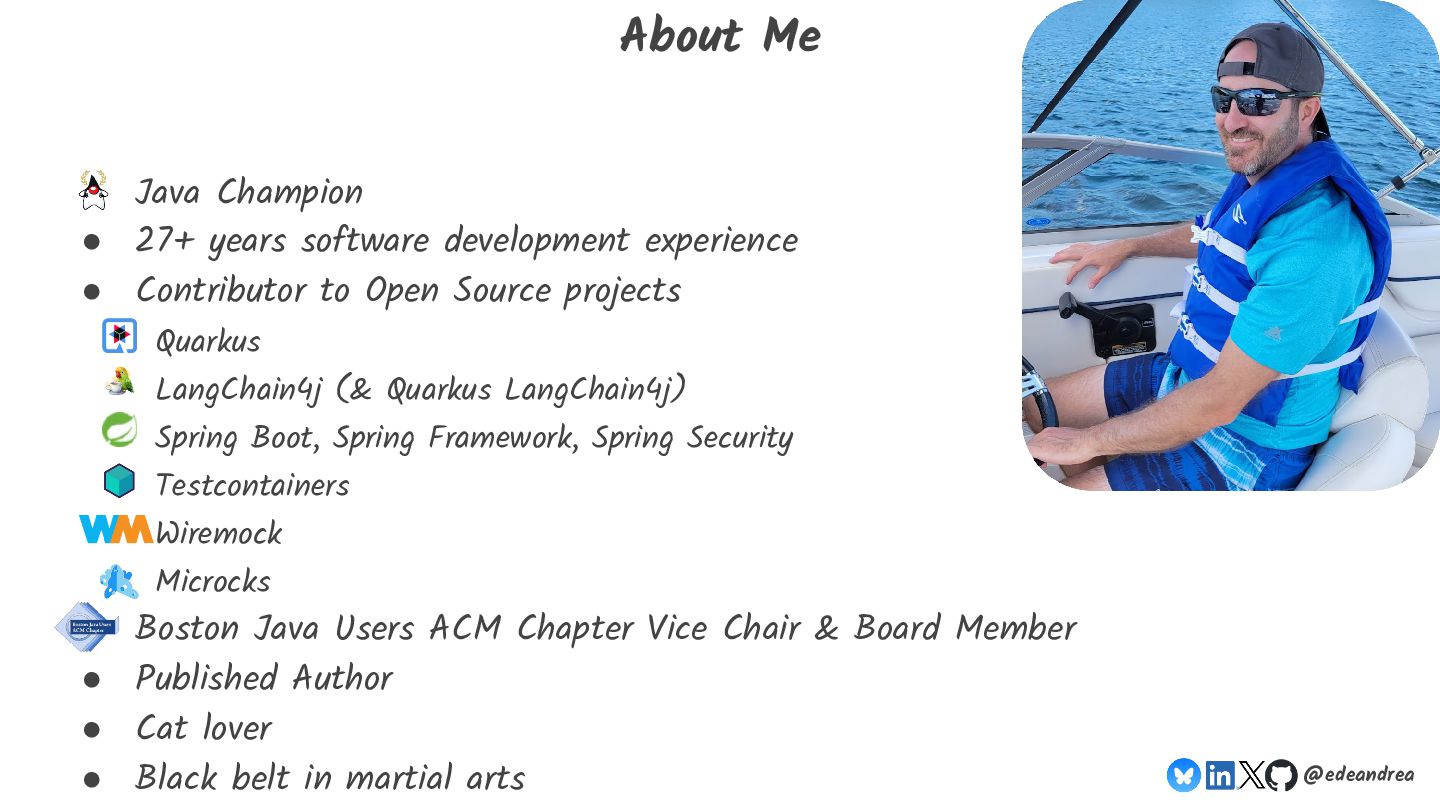 • Contributor to Open Source projects Quarkus LangChain4j (& Quarkus LangChain4j) Spring Boot, Spring Framework, Spring Security Testcontainers Wiremock Microcks • Boston Java Users ACM Chapter Vice Chair & Board Member • Published Author • Cat lover • Black belt in martial arts About Me