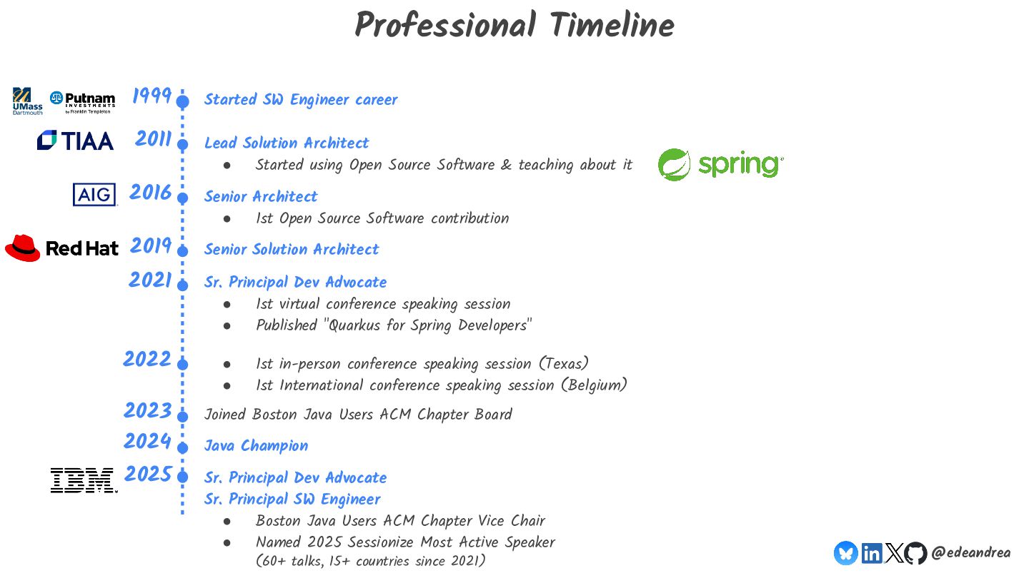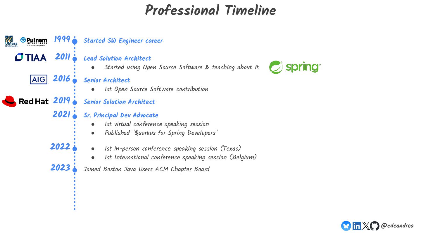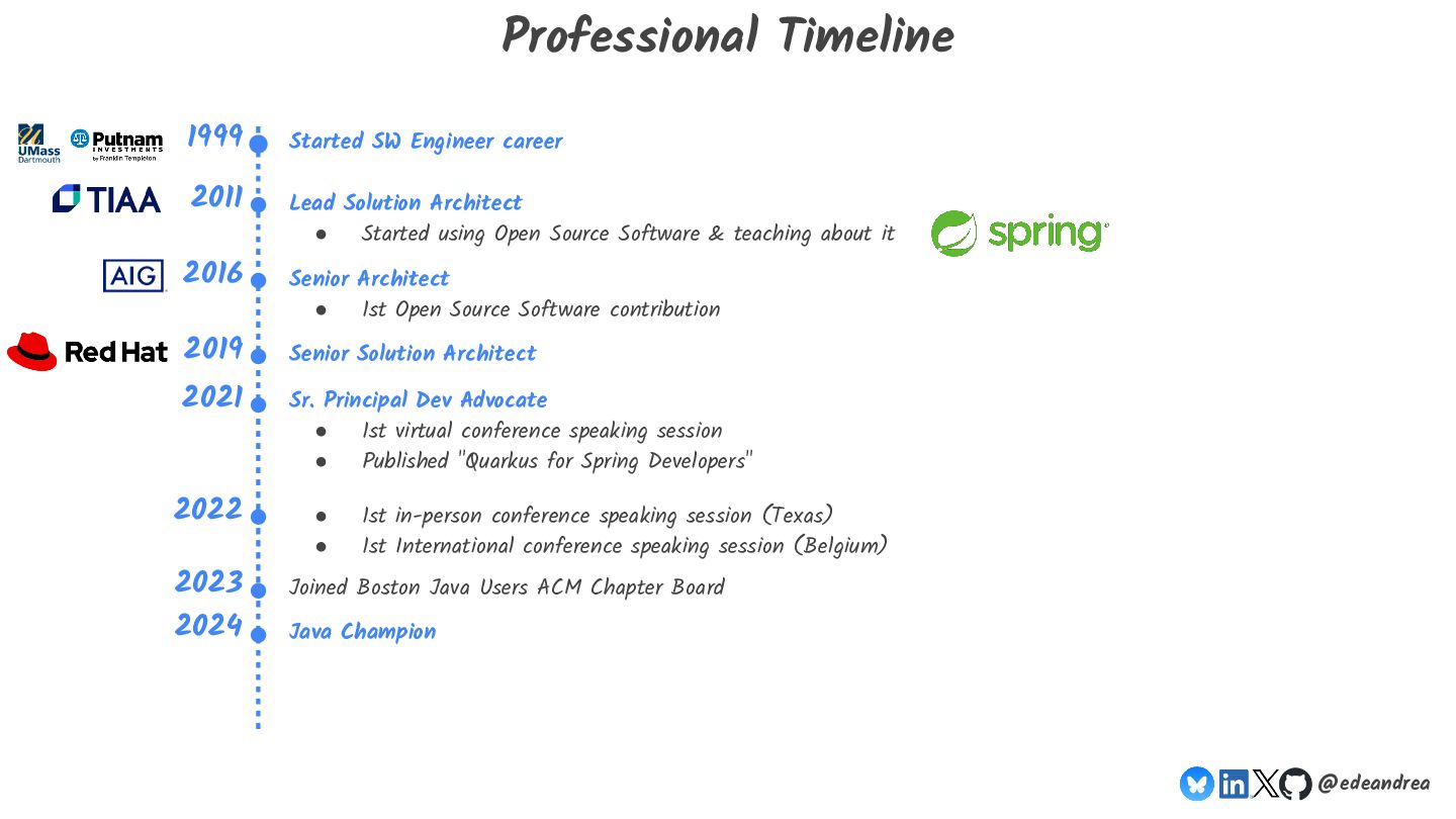 • Started using Open Source Software & teaching about it 2016 Senior Architect • 1st Open Source Software contribution 2019 Senior Solution Architect 2021 Sr. Principal Dev Advocate • 1st virtual conference speaking session • Published "Quarkus for Spring Developers" 2022 • 1st in-person conference speaking session (Texas) • 1st International conference speaking session (Belgium) 2024 Java Champion 2023 Joined Boston Java Users ACM Chapter Board Professional Timeline