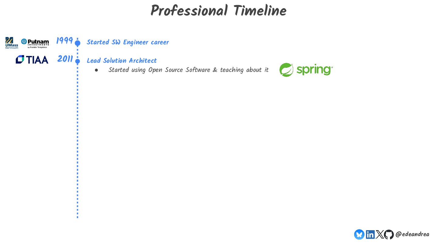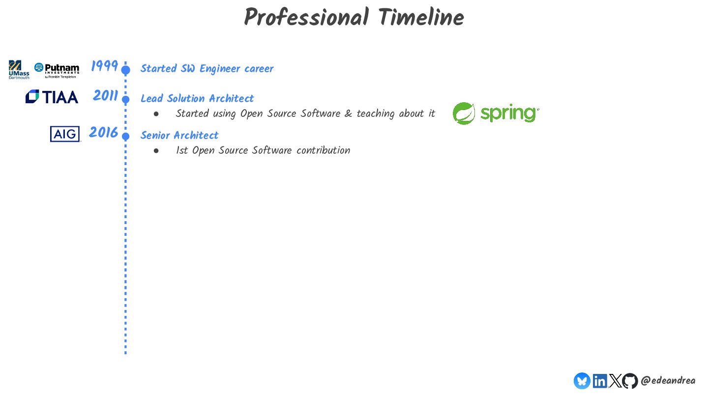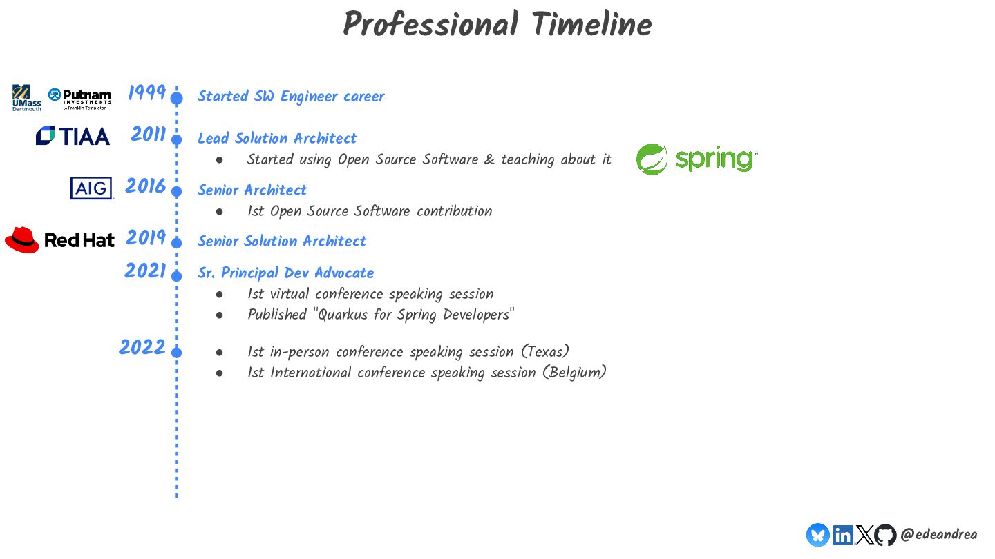 • Started using Open Source Software & teaching about it 2016 Senior Architect • 1st Open Source Software contribution 2019 Senior Solution Architect 2021 Sr. Principal Dev Advocate • 1st virtual conference speaking session • Published "Quarkus for Spring Developers" 2022 • 1st in-person conference speaking session (Texas) • 1st International conference speaking session (Belgium) 2024 Java Champion 2023 Joined Boston Java Users ACM Chapter Board Professional Timeline