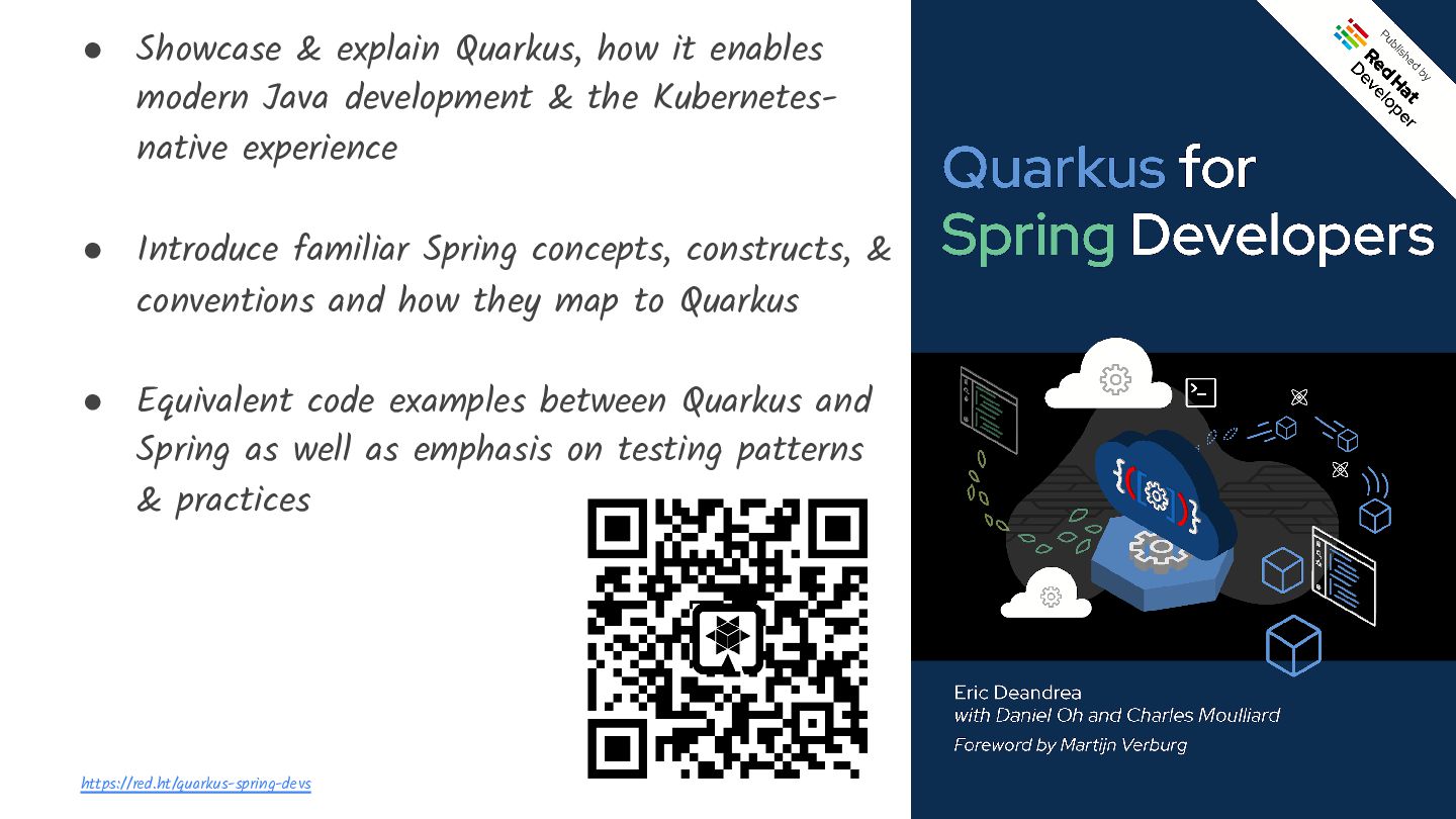 Java development & the Kubernetes- native experience • Introduce familiar Spring concepts, constructs, & conventions and how they map to Quarkus • Equivalent code examples between Quarkus and Spring as well as emphasis on testing patterns & practices 3 https://red.ht/quarkus-spring-devs