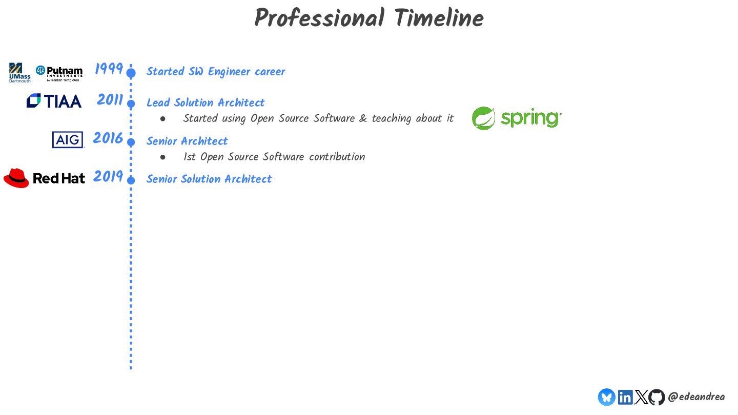 • Started using Open Source Software & teaching about it 2016 Senior Architect • 1st Open Source Software contribution 2019 Senior Solution Architect 2021 Sr. Principal Dev Advocate • 1st virtual conference speaking session • Published "Quarkus for Spring Developers" 2022 • 1st in-person conference speaking session (Texas) • 1st International conference speaking session (Belgium) 2023 Joined Boston Java Users ACM Chapter Board Professional Timeline