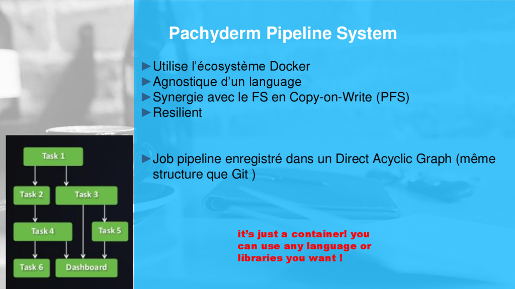 avec le FS en Copy-on-Write (PFS) ►Resilient ►Job pipeline enregistré dans un Direct Acyclic Graph (même structure que Git ) it’s just a container! you can use any language or libraries you want !