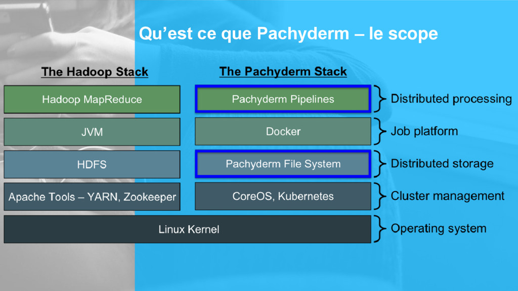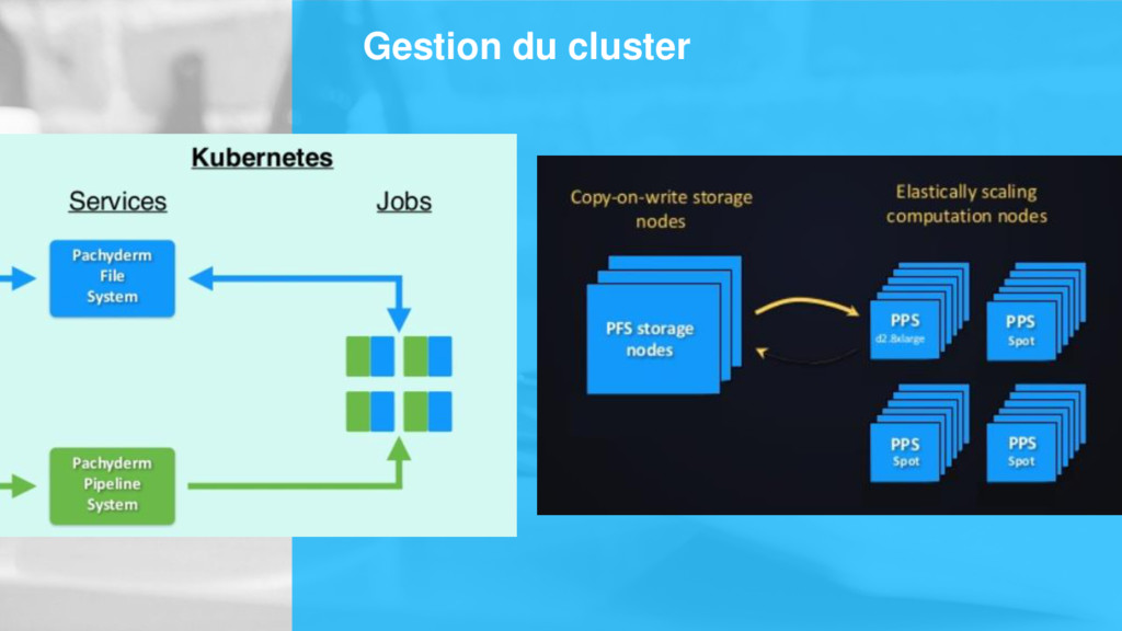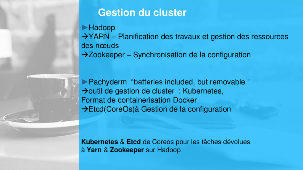 gestion des ressources des nœuds Zookeeper – Synchronisation de la configuration ►Pachyderm “batteries included, but removable.” outil de gestion de cluster : Kubernetes, Format de containerisation Docker Etcd(CoreOs)à Gestion de la configuration Kubernetes & Etcd de Coreos pour les tâches dévolues à Yarn & Zookeeper sur Hadoop