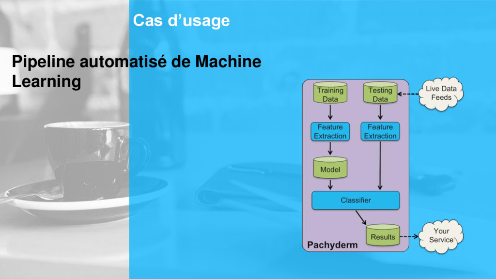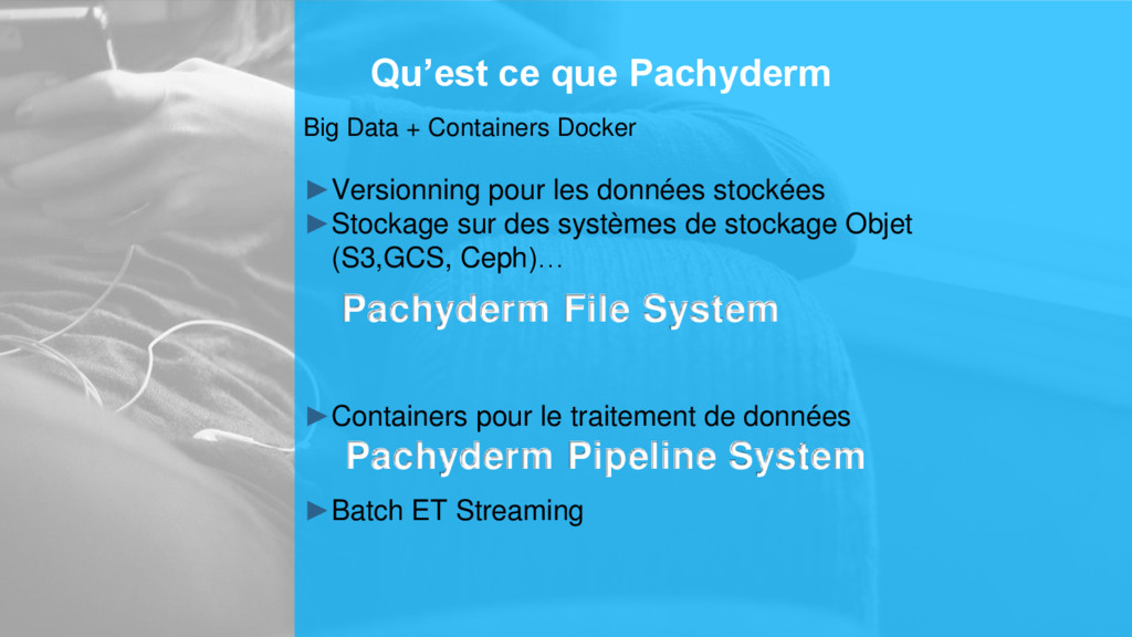 pour les données stockées ►Stockage sur des systèmes de stockage Objet (S3,GCS, Ceph)… ►Containers pour le traitement de données ►Batch ET Streaming Pachyderm File System Pachyderm Pipeline System