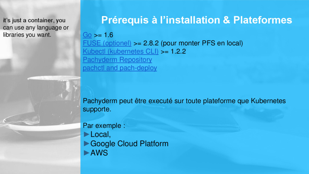 >= 2.8.2 (pour monter PFS en local) Kubectl (kubernetes CLI) >= 1.2.2 Pachyderm Repository pachctl and pach-deploy Pachyderm peut être executé sur toute plateforme que Kubernetes supporte. Par exemple : ►Local, ►Google Cloud Platform ►AWS it’s just a container, you can use any language or libraries you want.
