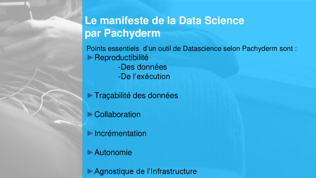 d’un outil de Datascience selon Pachyderm sont : ►Reproductibilité -Des données -De l’exécution ►Traçabilité des données ►Collaboration ►Incrémentation ►Autonomie ►Agnostique de l’Infrastructure